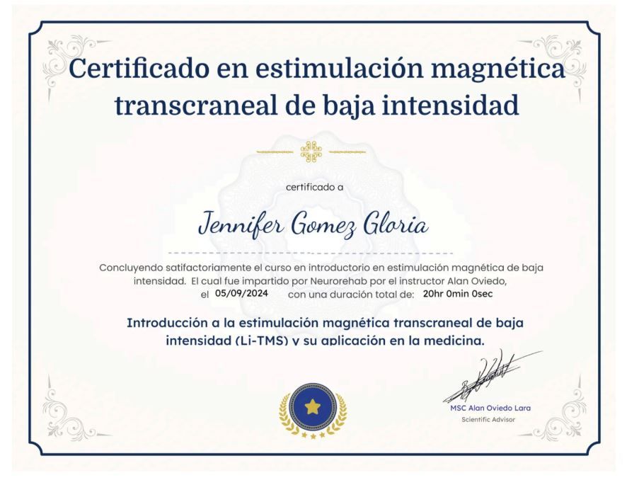 Me interesa estar en constante formación y actualización. Mis últimos cursos se enfocan en terapias informadas en trauma, lo que me ha permitido acompañar procesos psicológicos que requieren un enfoque más integral y comprensivo. Además, cuento con capacitación en Estimulación Magnética Transcraneal de baja intensidad (LiTMS), una técnica no invasiva que complementa tratamientos para ansiedad, depresión, insomnio y TDAH.