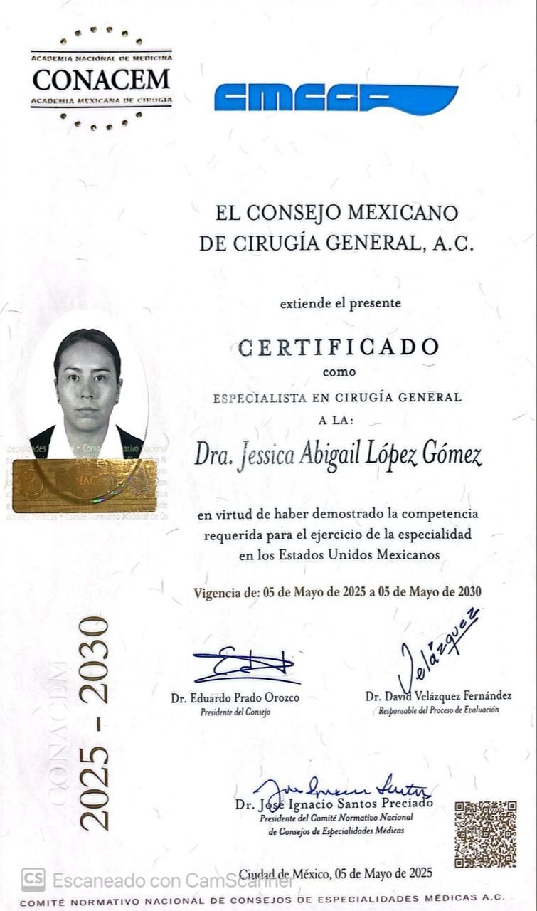 Hola, soy la Dra. Jessica Abigail López Gómez, soy cirujana general y laparoscopista. Estoy comprometida con brindarte una atención médica quirúrgica humana, honesta y precisa. Trabajo con los más altos estándares de calidad, ética y profesionalismo, siempre priorizando tu bienestar y acompañándote en cada etapa de tu proceso quirúrgico. Será un gusto ayudarte con la excelencia y calidez que mereces. ¡Contáctame!