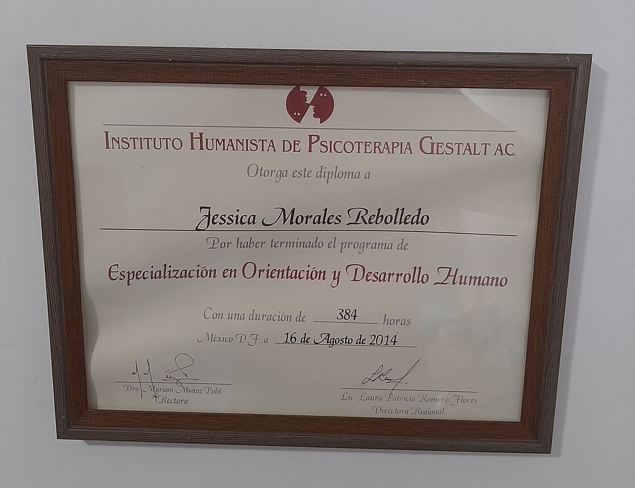 Hola, soy Jessica Morales Rebolledo, Lic. En Psicología por la UV (Universidad Veracruzana) con Habilidades en Desarrollo de Competencias Básicas para la Docencia a Nivel Primaria. Especialista en Orientación y Desarrollo Humano con Enfoque Humanista, Terapeuta en Psicoterapia Corporal, Psicóloga Deportiva y Tanatóloga Humanista. Soy Máster en Psicoterapia Gestalt. Mi trayectoria y experiencia profesional incluye: Psicoterapia con niños, adolescentes y adultos. Psicoterapia Familiar. Psicoterapia de Pareja. Tanatología. Rendimiento Deportivo mental y emocional. Adicciones. Duelos y pérdidas. Te invito a seguirme en mis redes y si necesitas ayuda, acude a una primera consulta psicológica, también puedes hacer de forma online desde cualquier espacio, así que anímate a continuar tu proceso terapéutico. Será un gusto acompañarte.