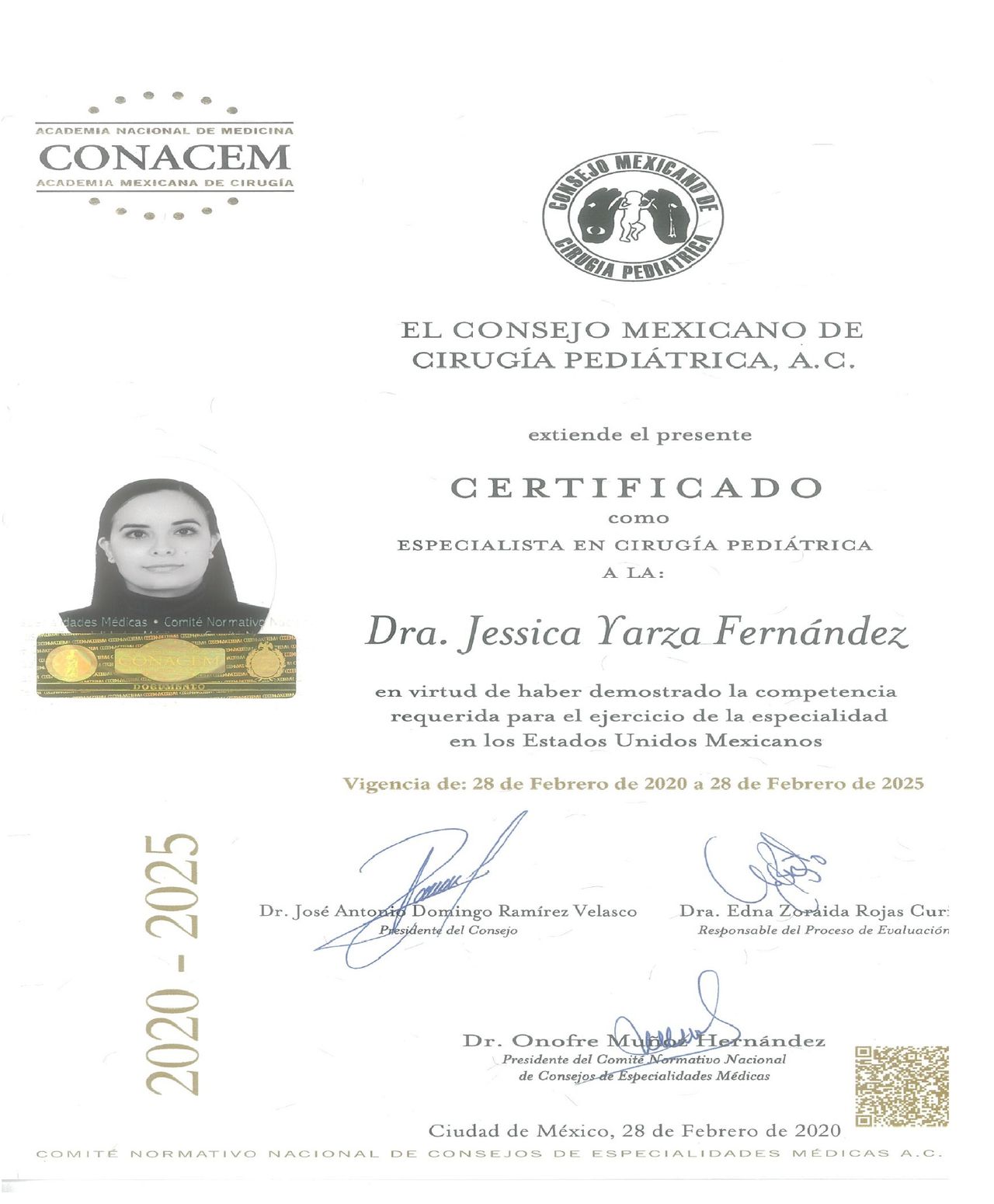 El cuidado integral de los recién nacidos, niños y adolescentes es mi prioridad por lo que continuo con la actualización constante y capacitación para poder brindarles la mejor atención, cuento con la certificación vigente expedida por el Colegio Mexicano de Cirugía Pediátrica.