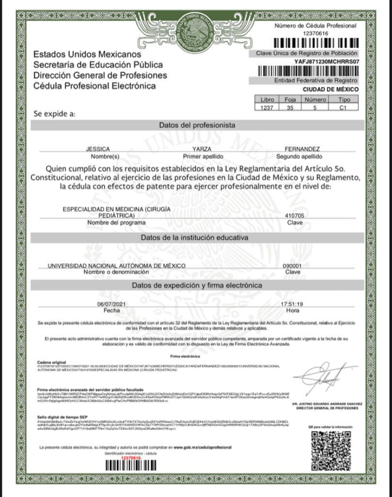 Hola, soy la doctora Jessica Yarza Fernández nacida en Ciudad Juárez. Estudie medicina general en la Universidad Autónoma de Ciudad Juárez. Durante mi formación amé con locura y pasión trabajar con: recién nacidos, niñas, niños y adolescentes por lo que me especialicé en el cuidado y atención de estos. Inicié el primer año de pediatría en Ciudad Juárez en el año 2014, luego continué el segundo año en Ciudad Obregón Sonora y a medida que me descubría en este campo me llamó muchísimo la atención la cirugía pediátrica por lo que me subespecialicé en esta misma realizando mi subespecialidad en Centro Médico Nacional de Occidente en la ciudad de Guadalajara, Jalisco siendo acreditada por la Universidad Nacional Autónoma de México, finalizando mis estudios en el 2020, actualmente con experiencia en niños de 11 años.