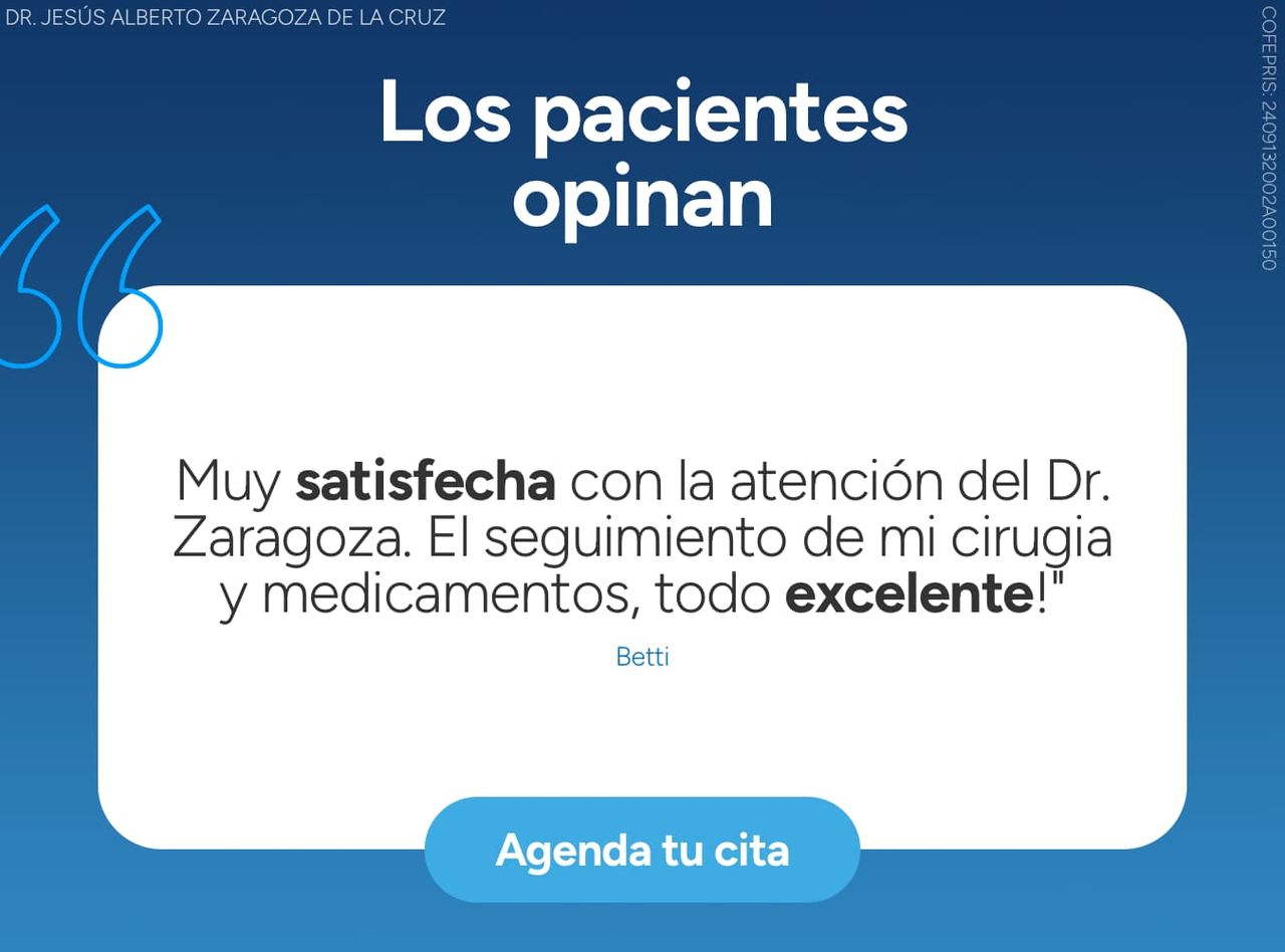 Quiero expresar mi más sincero agradecimiento al Dr. Jesús A. Zaragoza de la Cruz por la operación de tiroides que me realizó. Desde el primer momento me brindó confianza, profesionalismo y una atención humana que hizo toda la diferencia en un proceso que, sin duda, genera incertidumbre.