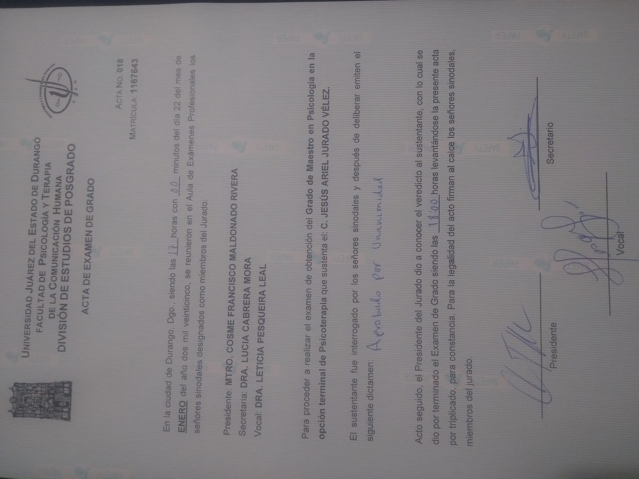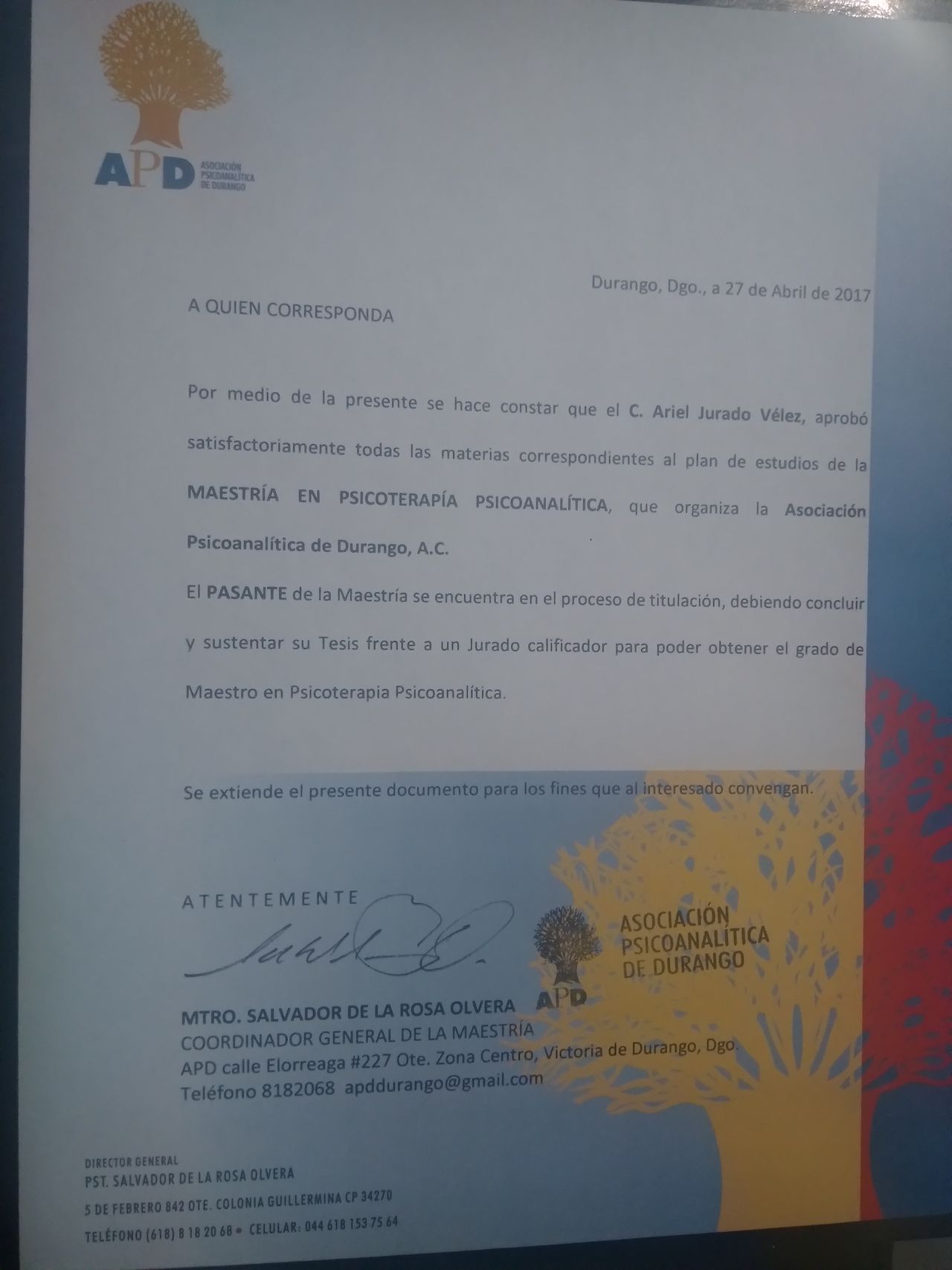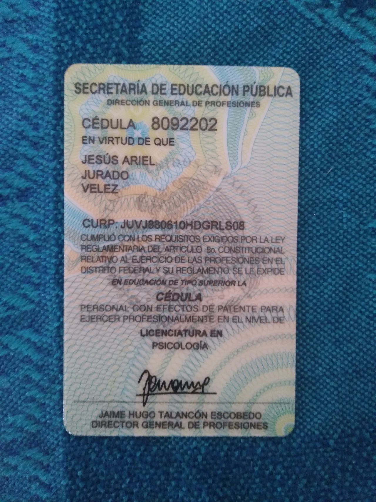 Quiero recomendar ampliamente al psicólogo Jesús Ariel Jurado Vélez. Es un profesional ético, responsable y comprometido con sus pacientes.