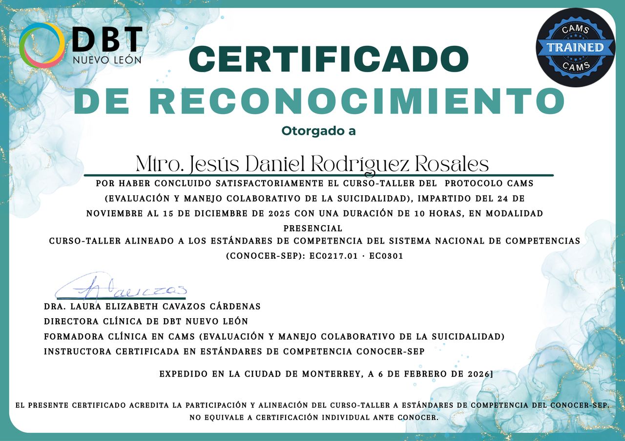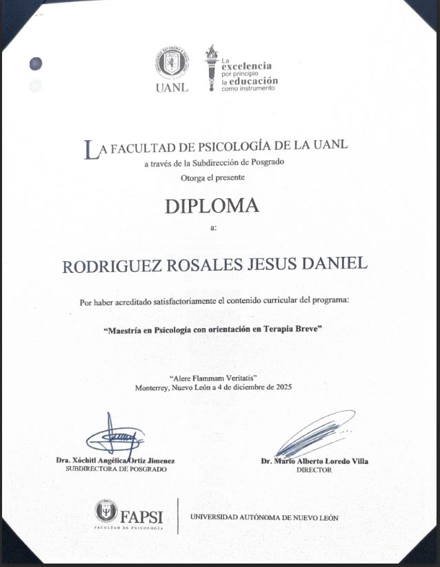 Soy Daniel Rodríguez, psicólogo y psicoterapeuta. Tengo estudios de licenciatura con enfoque en clínica cognitivo conductual y maestría en psicología con orientación en terapia breve, ambos por parte de la Facultad de Psicología UANL.