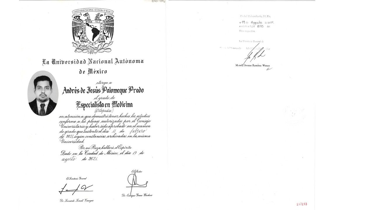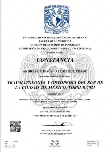 Traumatología y Ortopedia avalada por la Universidad Nacional Autónoma de México en el INSTITUTO NACIONAL DE REHABILITACIÓN (INR) el cual es considerado una de las mejores sedes de enseñanza y atención médica y quirúrgica en su ramo en México y Latino América.