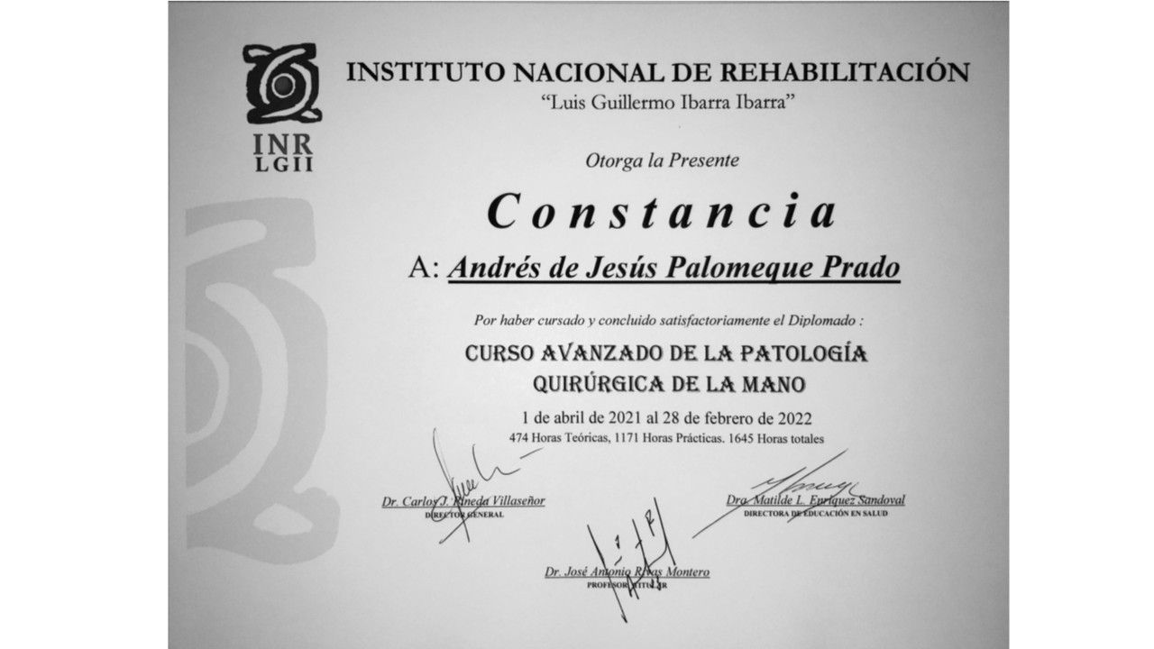 Diplomado de Alta especialidad en Patología Quirúrgica de la Mano, Instituto Nacional de Rehabilitación / UNAM
