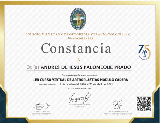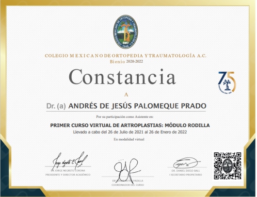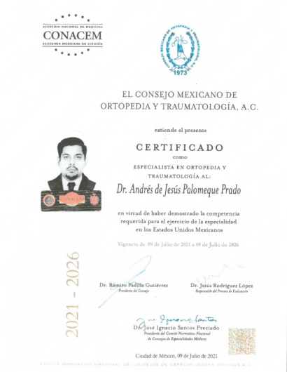 Certificado por el Consejo Mexicano de Ortopedia y Traumatología A.C. (registro 1/5826/21).