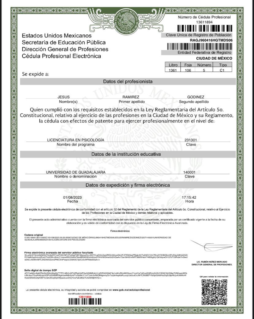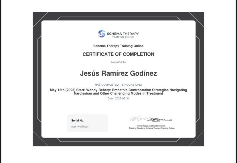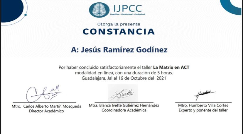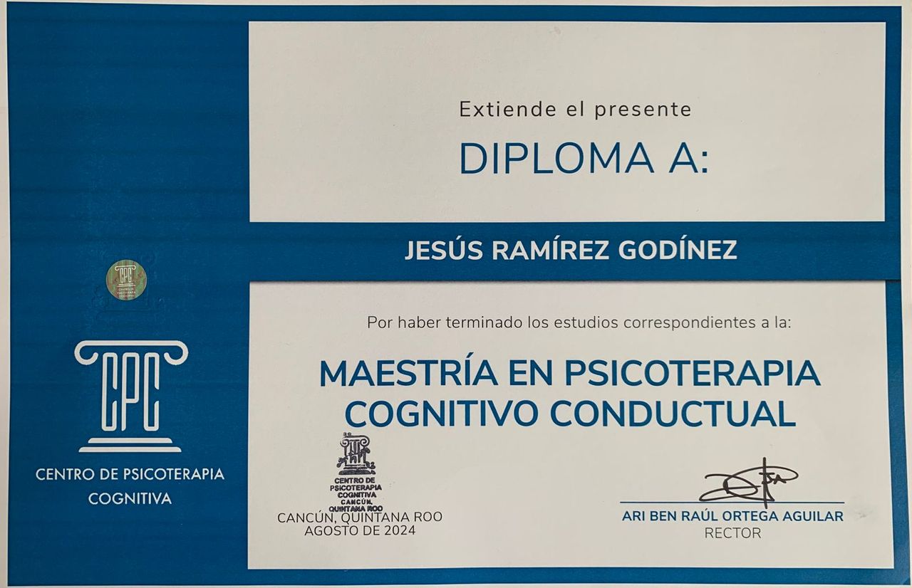 Soy Jesús Ramírez, Maestro en Psicoterapia Cognitivo Conductual (TCC) por el Centro de Psicoterapia Cognitiva, con formación complementaria en Terapia de Aceptación y Compromiso (ACT) y Terapia de Esquemas.