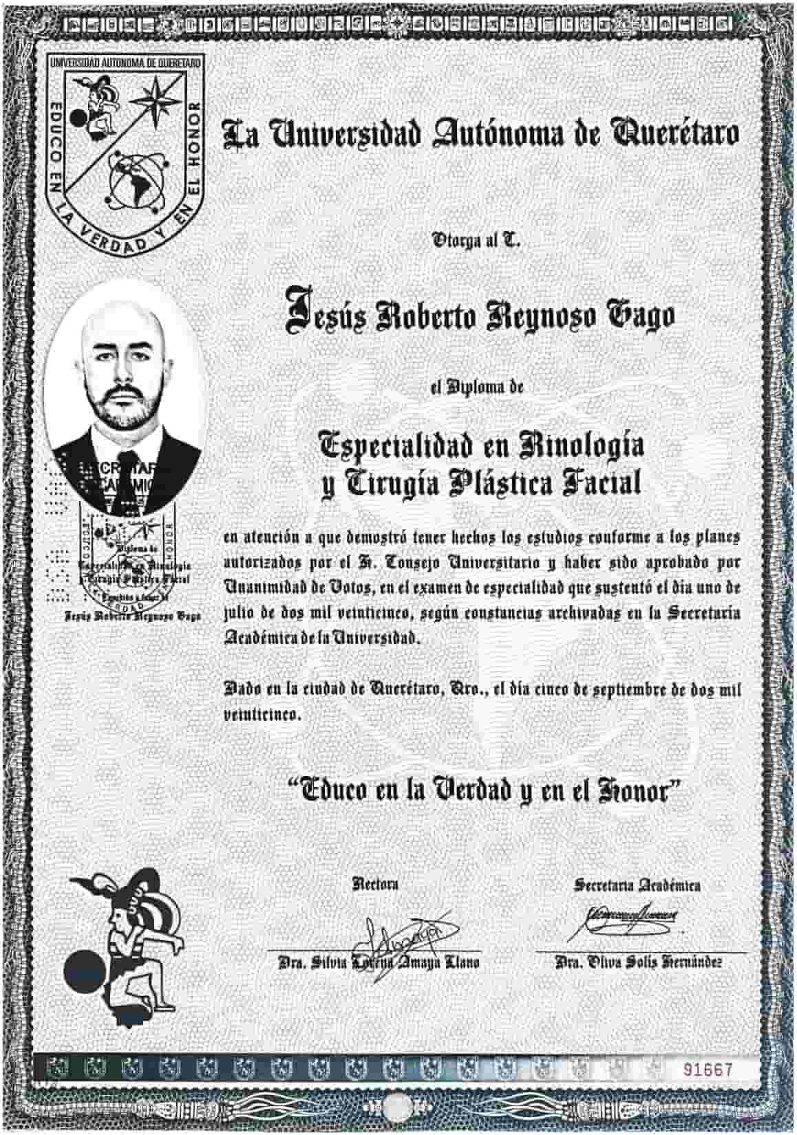 Soy el Dr. Jesús Reynoso Gago, especialista en Cirugía Plástica Facial y Rinología por la Universidad Autónoma de Querétaro, con título y cédula profesional, además soy especialista en Otorrinolaringología y Cirugía de Cabeza y Cuello por la Universidad Nacional Autónoma de México.
