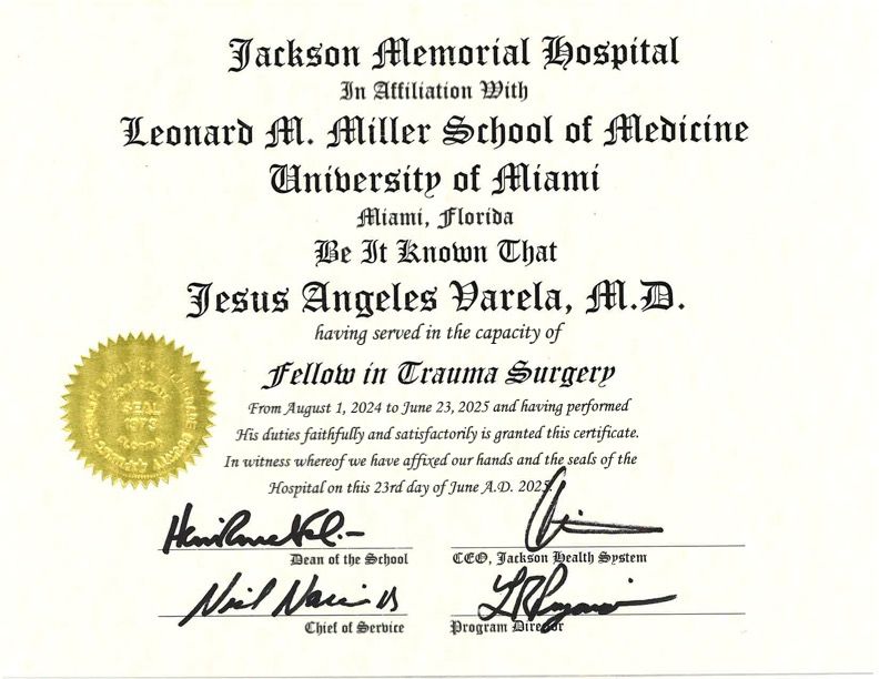 Cuento con una Subespecialidad en los Estados Unidos en Cuidados Críticos Quirúrgicos por la Universidad de Miami, lo que me permite brindar atención integral y especializada en situaciones de alta complejidad.