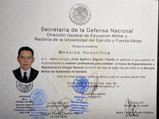 Médico Especialista en Cirugía General, egresado del Hospital Central Militar con Mención Honorífica por la Universidad del Ejército y Fuerza Aérea. Primer lugar de mi generación en la Escuela Militar de Graduados de Sanidad.