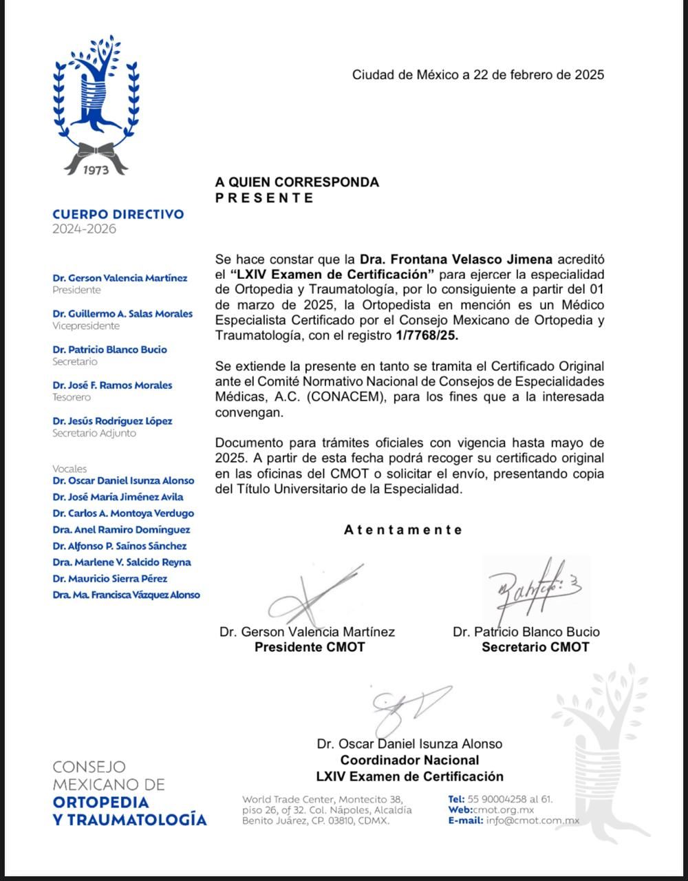 Así como también me encuentro certificada por el Consejo Mexicano de Ortopedia y Traumatología (CMOT).