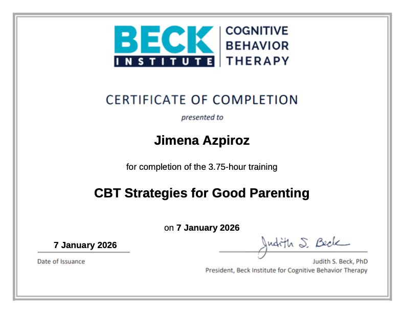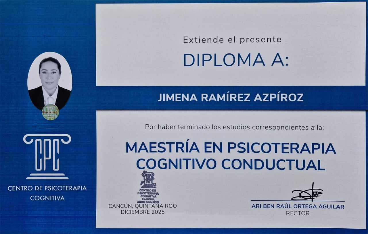 Actualmente curso la Maestría en Psicoterapia Cognitivo Conductual y me he formado en distintos cursos impartidos por instituciones como el Beck Institute, reconocido mundialmente en Terapia Cognitivo Conductual (TCC). Me identifico profundamente con este enfoque, ya que es una terapia basada en evidencia que te ofrece herramientas prácticas, que puedes aplicar durante tu proceso terapéutico, como al finalizarlo.