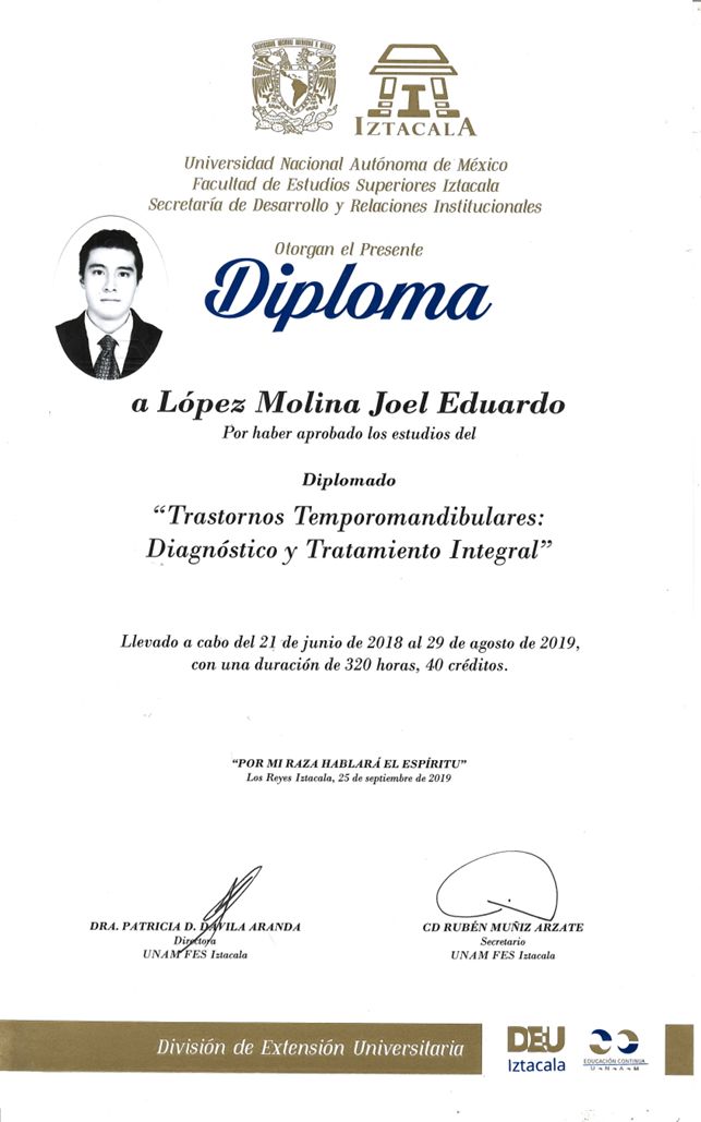 Cuento con un Diplomado en Trastornos Temporomandibulares, Diagnóstico y Tratamiento Integral, donde me especialicé en la elaboración de guardas oclusales personalizadas según las necesidades de cada paciente.