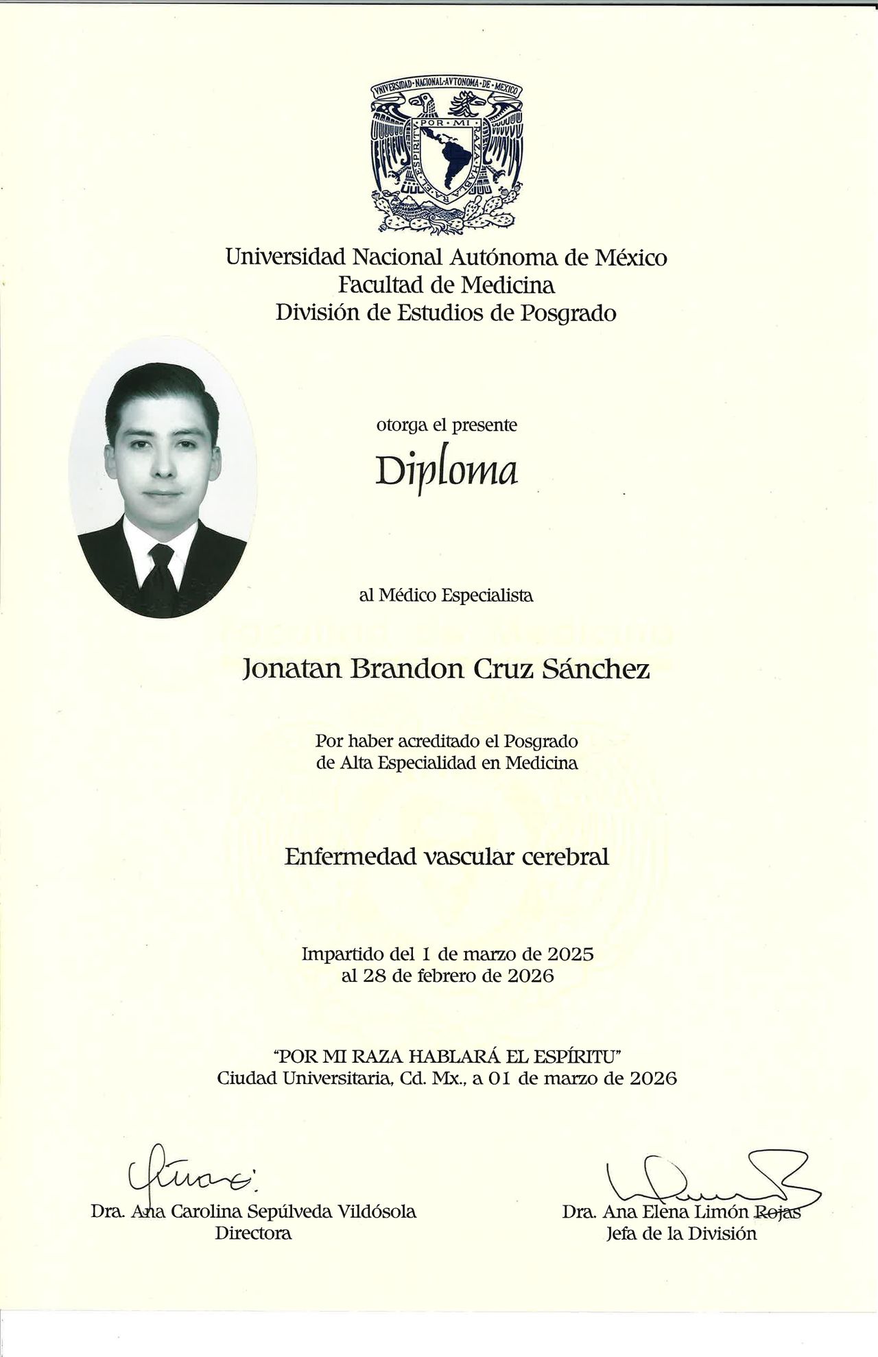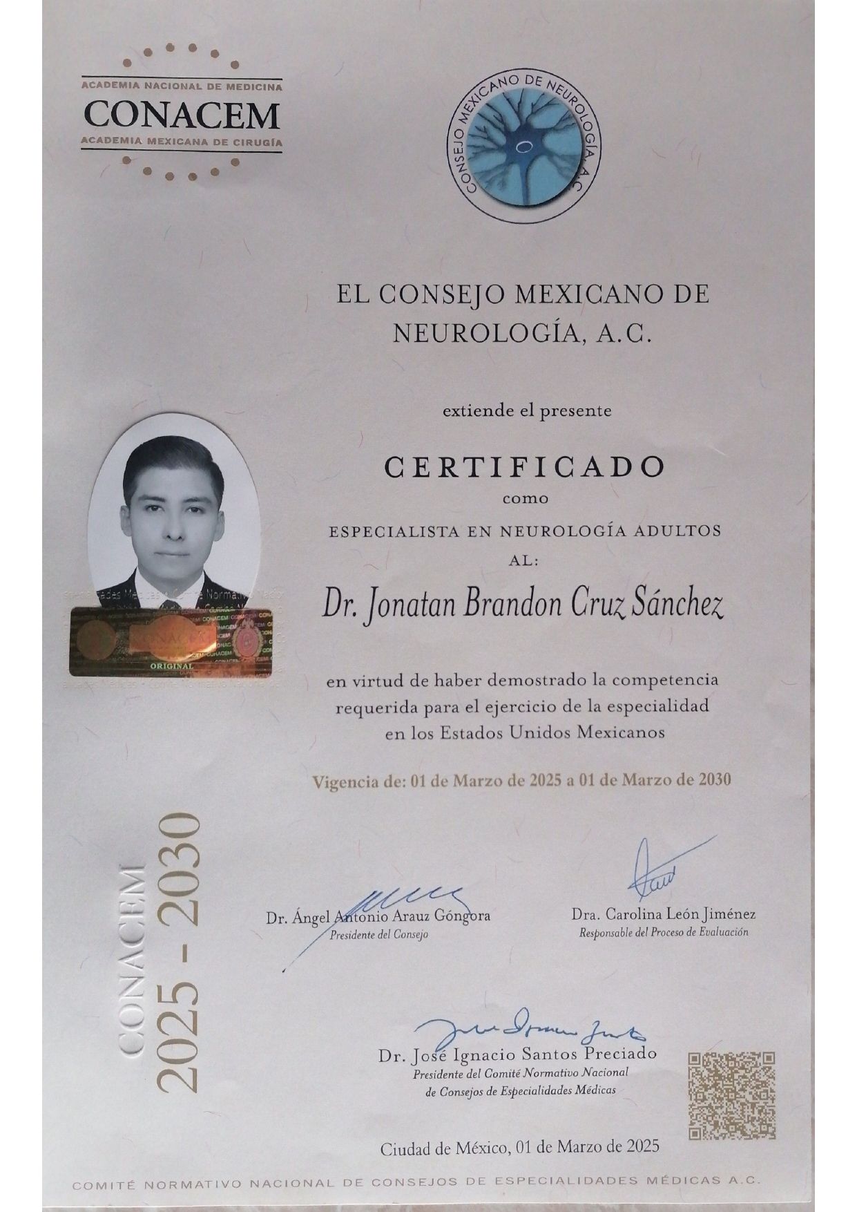 Soy médico neurólogo certificado por el Consejo Mexicano de Neurología, egresado del Hospital General de México, con aval académico de la UNAM. Posteriormente cursé una Alta Especialidad en Enfermedad Vascular Cerebral en el Instituto Nacional de Neurología y Neurocirugía, uno de los centros más importantes del país para el manejo de enfermedades neurológicas complejas, teniendo experiencia en el tratamiento de infarto cerebral,hemorragia intracraneal,cefaleas,epilepsia, trastornos de movimiento (Enfermedad de Parkinson), demencias (enfermedad de Alzheimer), enfermedades desmielinizantes (esclerosis multiple), trastornos de equilibrio (vertigo) y otras muchas mas enfermedades neurologicas