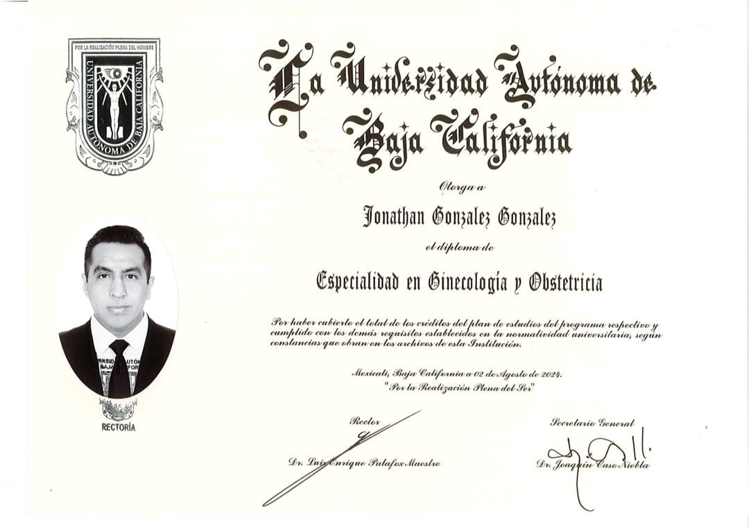 Egresado De La Especialidad de Ginecologia y Obstetricia por la Universidad Autonoma De Baja California. Cuento con la Certifiacion del Consejo Mexicano de Ginecologia yObstetricia(CMGO). Diplomado en Colposcopia y Patologia Vulvovaginal Avalado por Universidad Mesoamericana Diplomado en Ginecologia Endocrinologica avalado por la Universidad Nacional Autonoma de Mexico. Diplomado en Climaterio y Menopausia. Diplomado en Ultrasonido Obstetrico Avalador Por Medicina Fetal Mexico