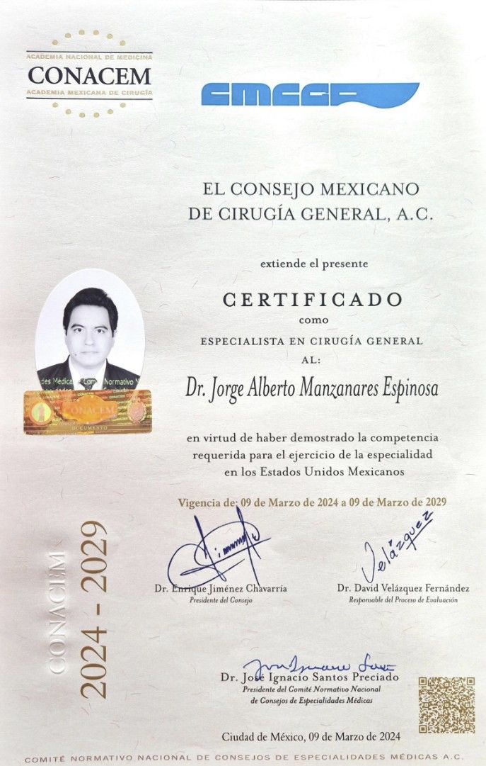 Soy Cirujano General certificado por el Consejo Mexicano de Cirugía General. Realicé mi especialidad en el Hospital General Zacatecas, avalado por la Universidad Autónoma de Zacatecas. Puedo ayudarte con procedimientos de aparato digestivo y pared abdominal, abiertos y por mínima invasión (Cirugía laparoscópica), así como urgencias quirúrgicas.