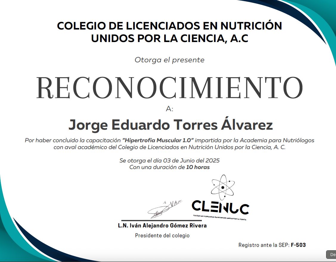 Licenciado en nutrición con diplomado en nutrición deportiva y fisiología del ejercicio, certificación como antropometrista ISAK I y certificación por el Colegio Americano del Deporte (ACSM) de Exercise is Medicine. Educador en diabetes por la asociación mexicana de diabetes en Guanajuato A.C.