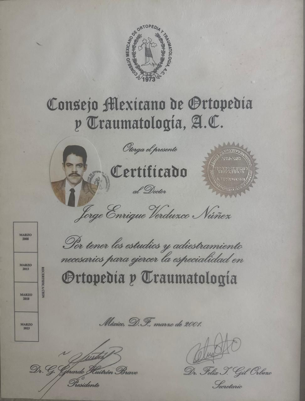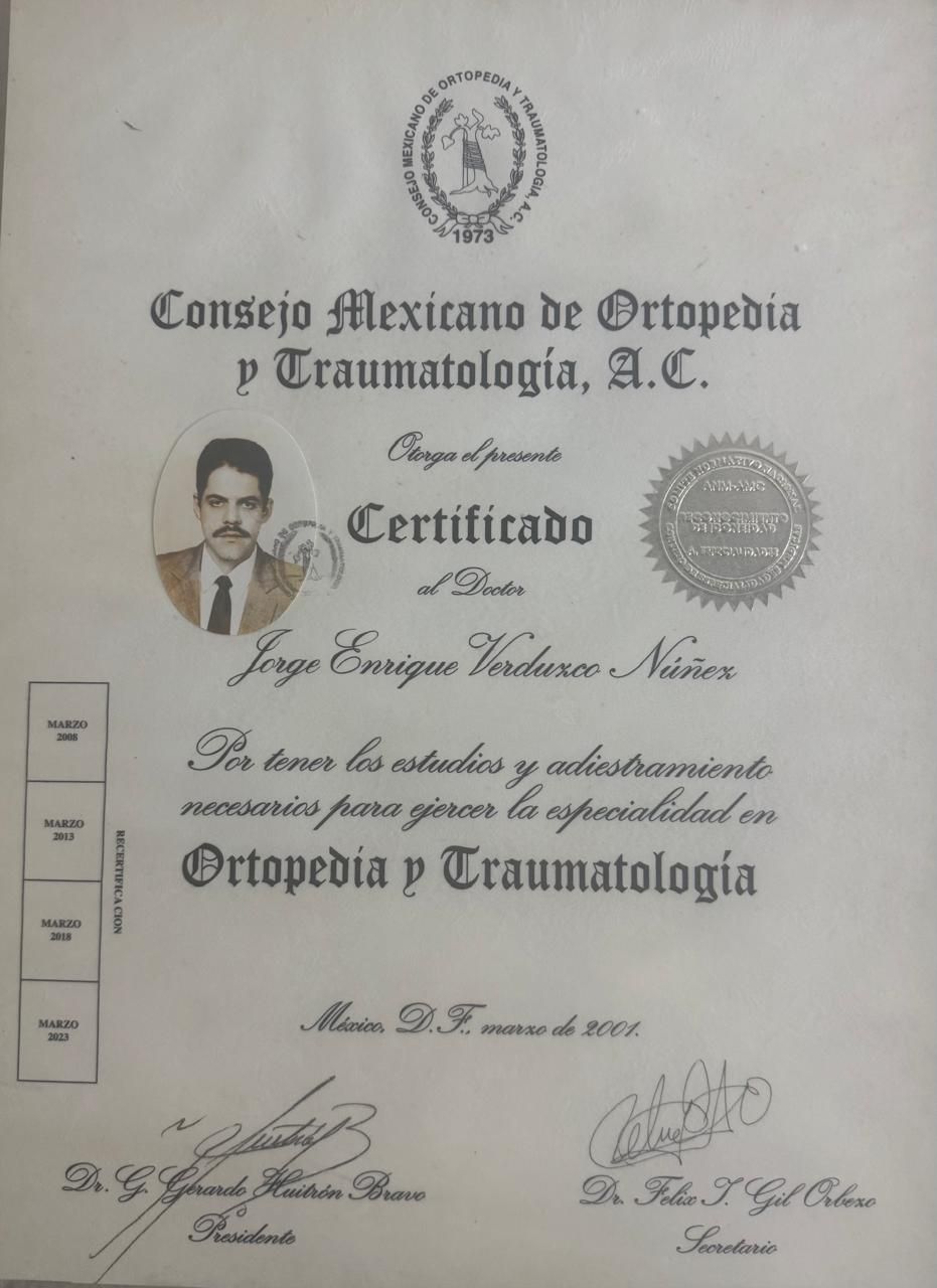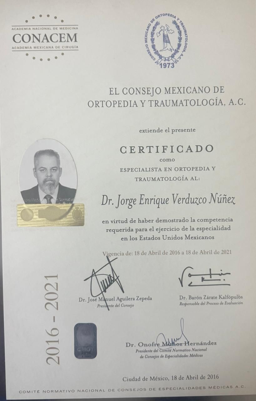 Me llamo Jorge Enrique Verduzco Núñez. Soy Médico Cirujano por la Universidad Veracruzana y especialista en Ortopedia y Traumatología por el Sector Salud, con cédulas profesionales 1549621 y 3174507 respectivamente