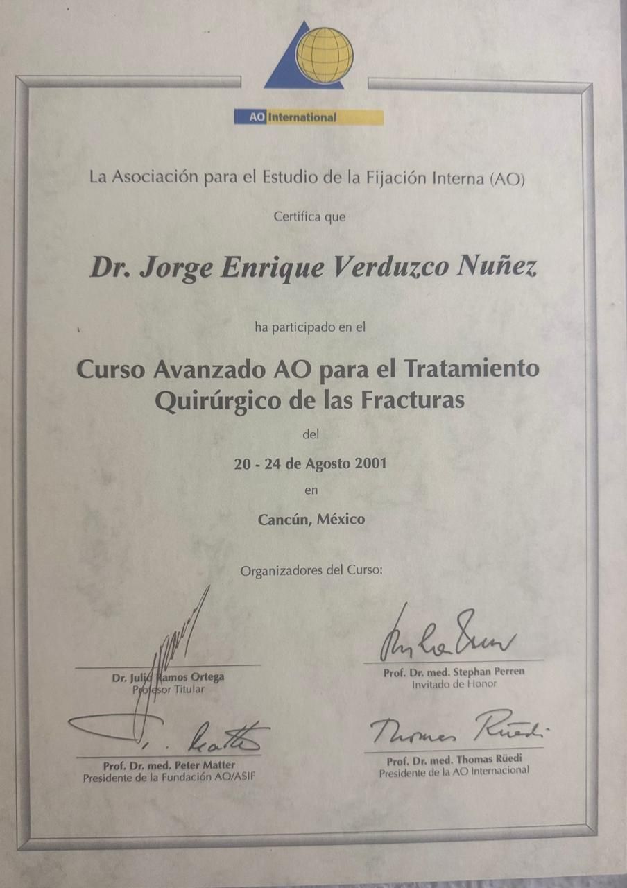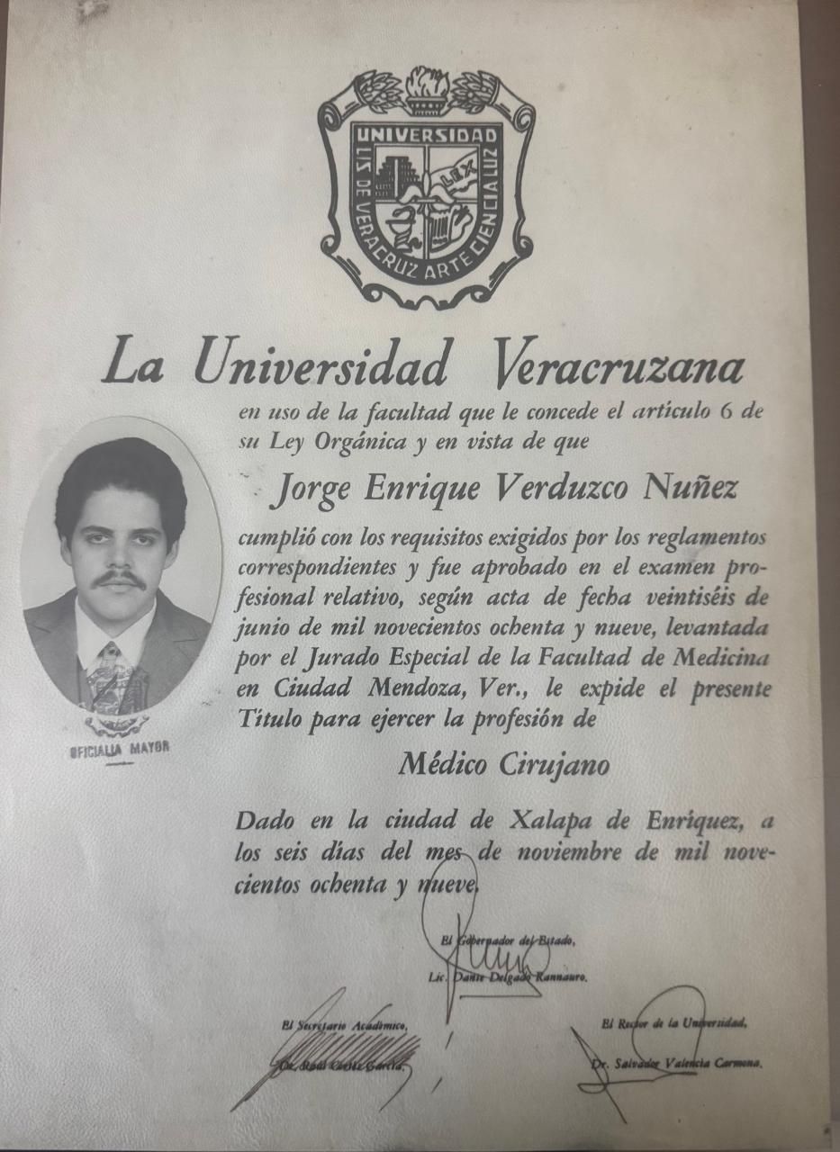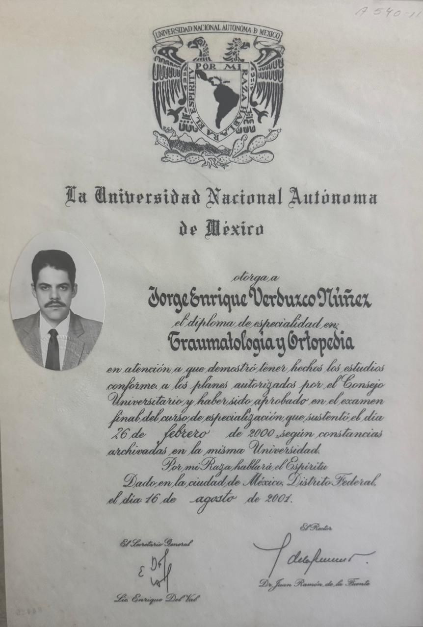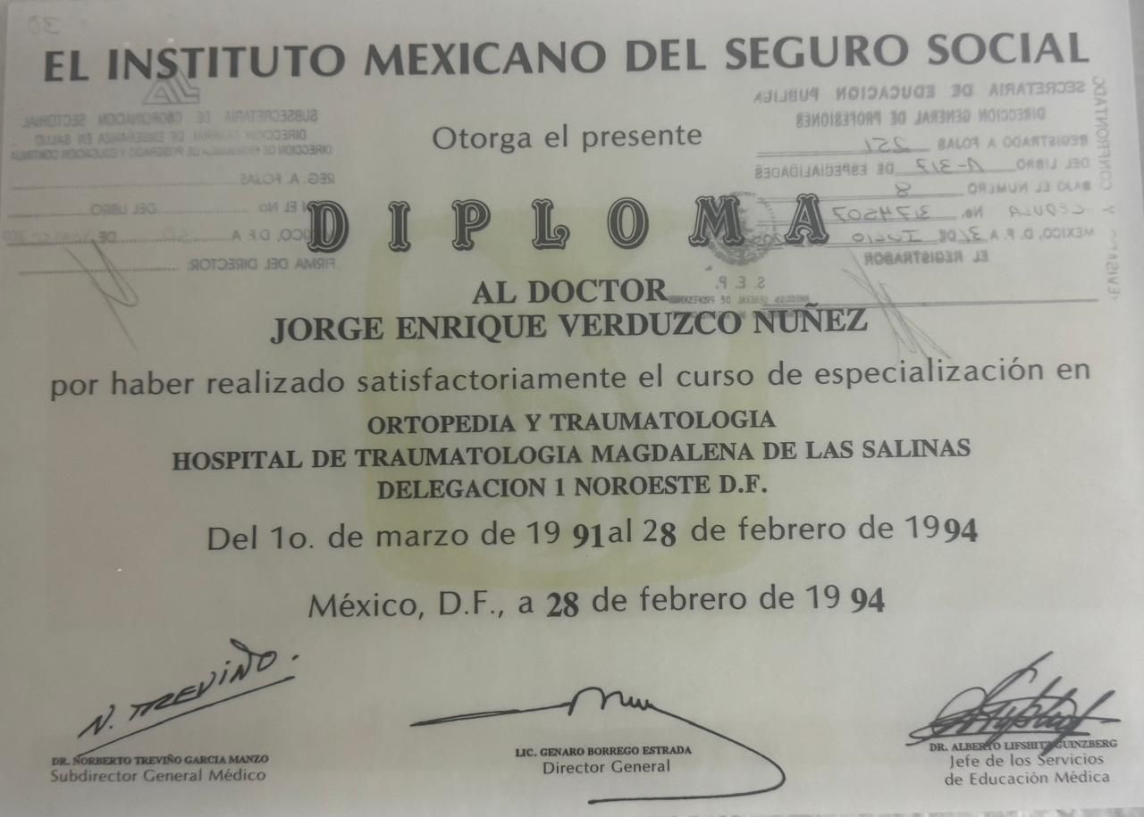 Me llamo Jorge Enrique Verduzco Núñez. Soy Médico Cirujano por la Universidad Veracruzana y especialista en Ortopedia y Traumatología por el Sector Salud, con cédulas profesionales 1549621 y 3174507 respectivamente