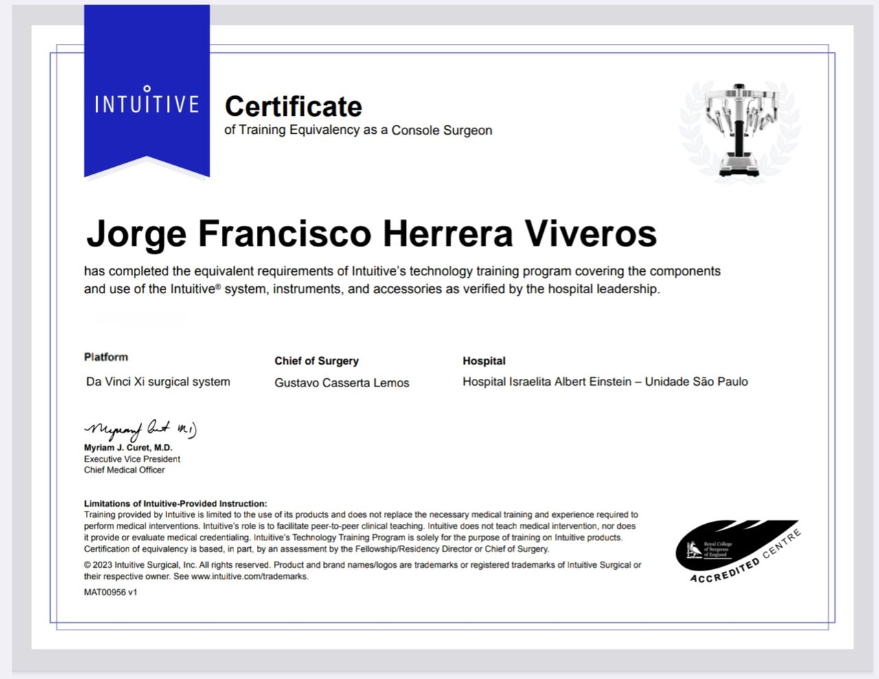 Cuento además con formación posgraduada en Cirugía Robótica realizada en el Hospital Israelita Albert Einstein de São Paulo, Brasil, considerado el mejor hospital de Latinoamérica.