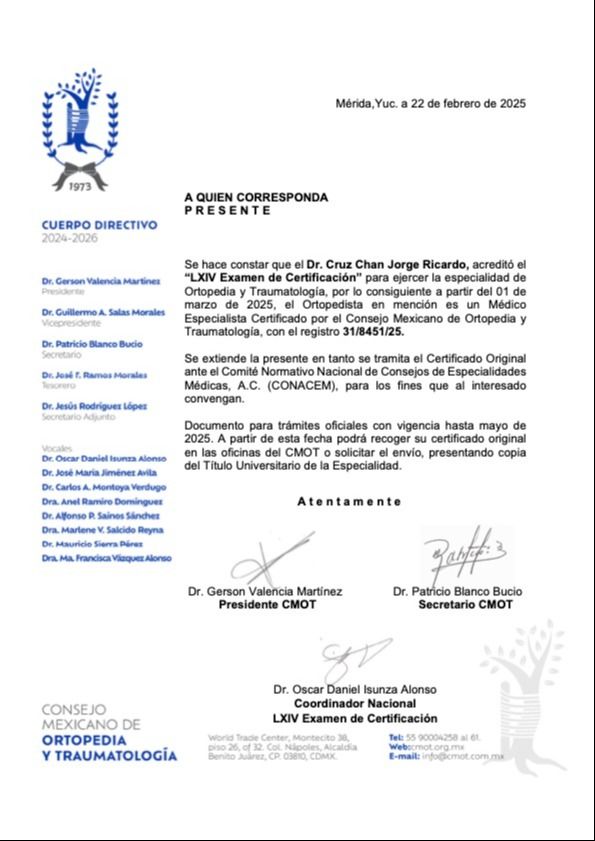 Soy médico especialista en Ortopedia y Traumatología, con enfoque en el diagnóstico y tratamiento integral de enfermedades y lesiones del sistema musculoesquelético.