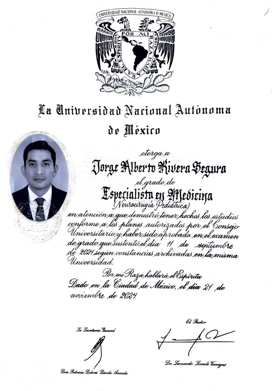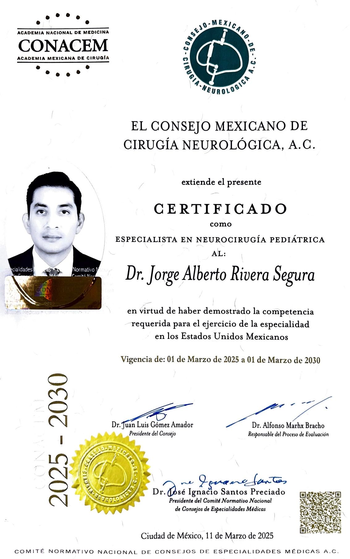 Me formé como médico cirujano en la Universidad La Salle y cursé la especialidad en neurocirugía en la Universidad Nacional Autónoma de México (UNAM), con una subespecialidad en neurocirugía pediátrica. Cuento con certificación vigente por el Consejo Mexicano de Cirugía Neurológica (CMCN) y soy miembro de la Sociedad Internacional de Neurocirugía Pediátrica (ISPN).