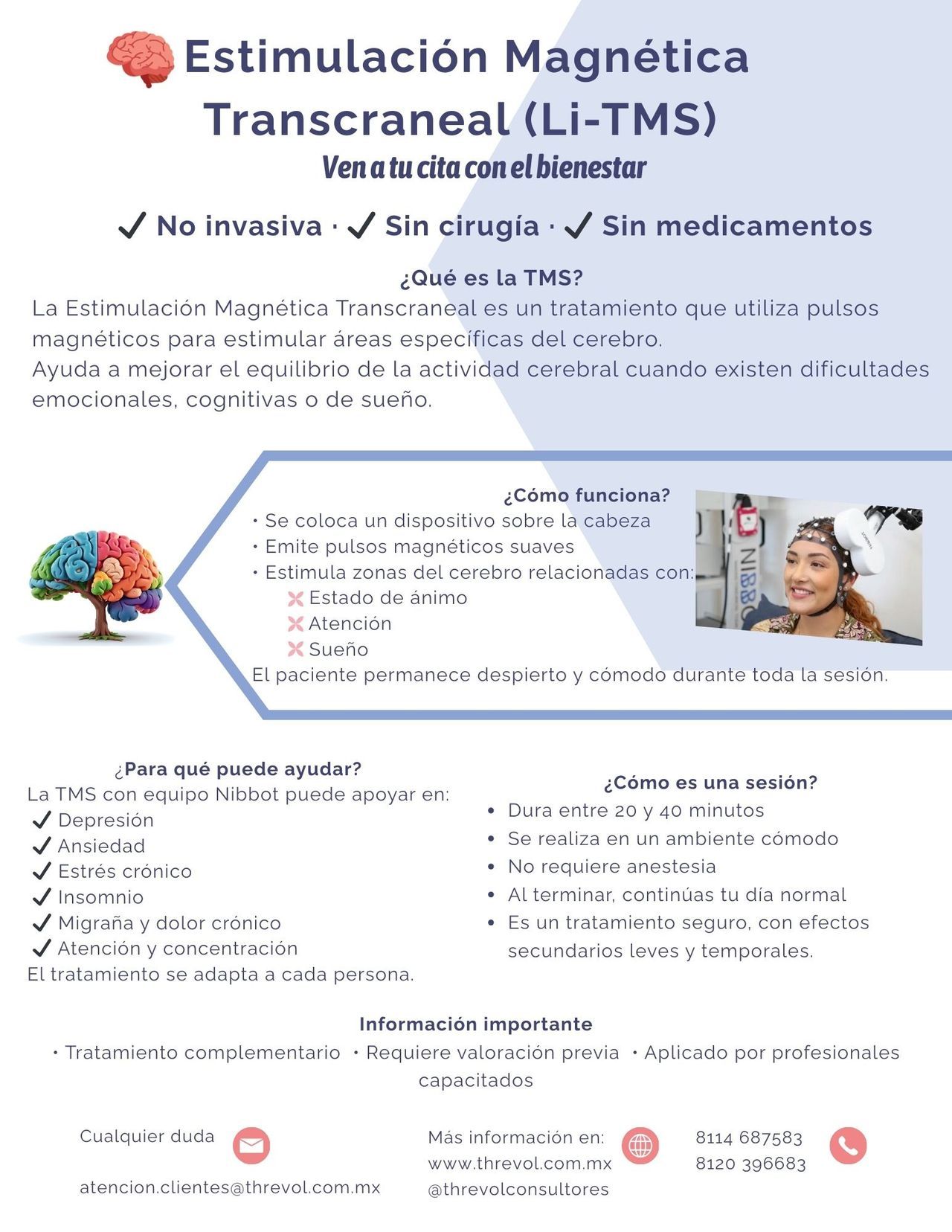 Por otra parte me he certificado en Estimulación Magnética Transcraneal (TMS) de Baja Intensidad con NeuroRehab para la operación de Equipo NIBBOT con el cual contamos en el Consultorio.