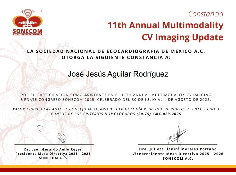 Cuento con una formación de alta especialidad en el uso de ultrasonido cardíaco avanzado (Ecocardiografía), el cual realicé en Hospital Ángeles Lomas (avalado por la UNAM), donde me entrené en el uso de las técnicas más avanzadas de ultrasonido cardíaco. Esta herramienta me permite observar tu corazón "en tiempo real" para detectar anomalías en las válvulas, la fuerza y anatomía del músculo cardíaco o secuelas de enfermedades previas.