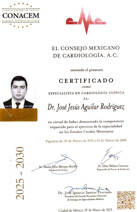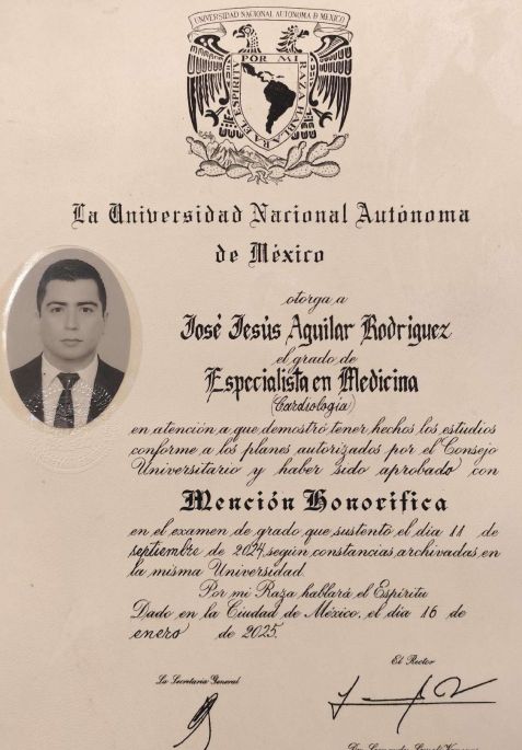 Mi formación y Especialización, realicé dos años de especialización en Medicina Interna en Centro Médico Nacional Siglo XXI, y posteriormente me derive a la Especialidad de Cardiología en Hospital de Cardiología de Centro Médico Nacional Siglo XXI (avalado por la UNAM), donde me formé para la atención de patologías cardíacas con alto grado de complejidad, graduándome con Mención Honorífica de mi Especialidad.