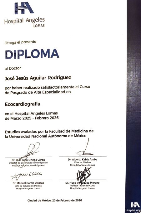 Hola, mi nombre es Jesús Aguilar, soy Especialista en Cardiología con Alta Especialidad en Ecocardiografía, y mi enfoque se centra en ofrecerte una atención cardiológica integral: desde la prevención y detección temprana hasta el tratamiento avanzado de enfermedades del corazón ya establecidas.