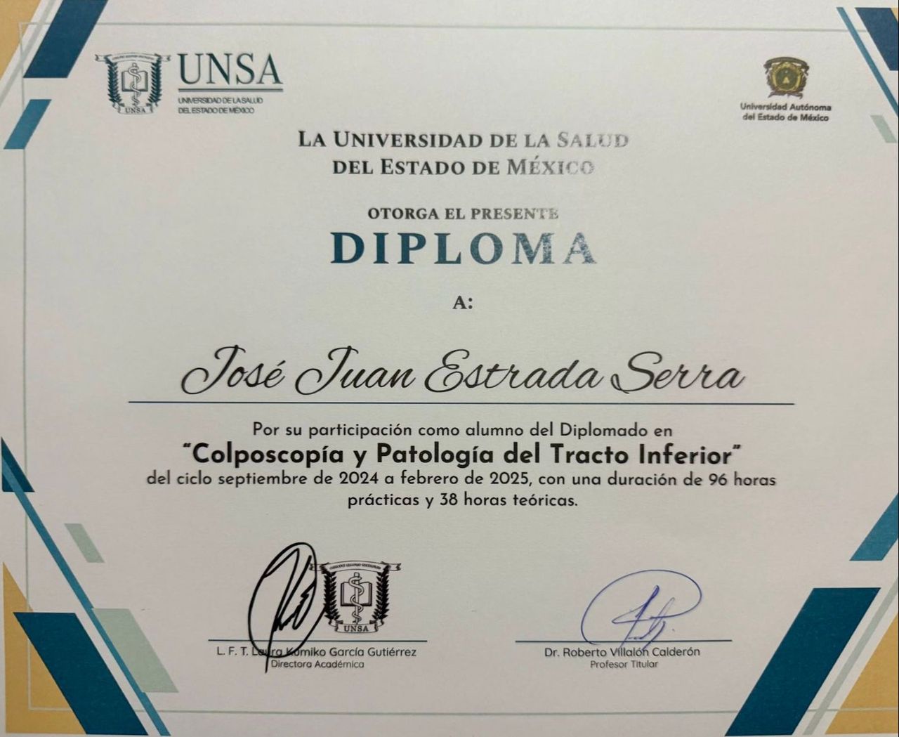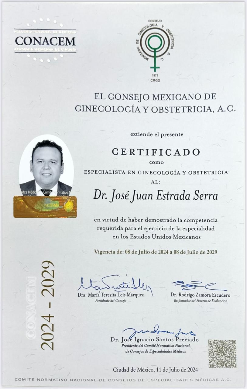 Soy el Dr. José Juan Estrada Serra, cuento con una sólida formación académica y una profunda dedicacion hacia el bienestar de mis pacientes, egresado como Médico Cirujano de la Facultad de Medicina en Ciudad Universitaria perteneciente a la Universidad Nacional Autónoma de México, especialista en Ginecología y Obstetricia en el Insitituto Materno Infantil del Estado de México, certificado por el Consejo Mexicano de Ginecología y Obstetricia, cuento con estudios en Endocrinología Ginecológica y Andrología y capacitado para brindar educación para promover la Lactancia Materna.