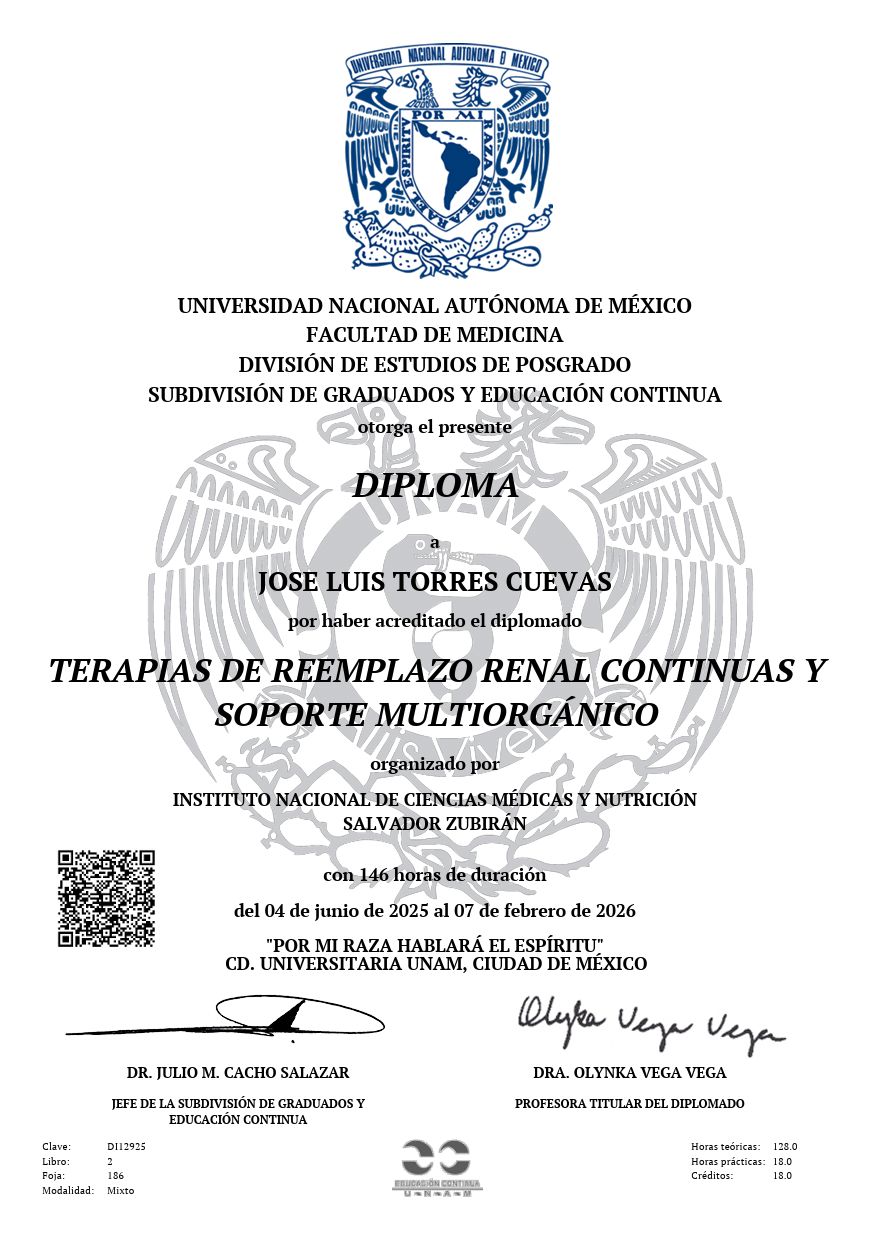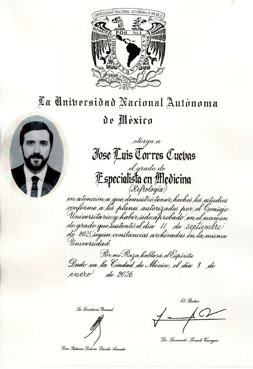 Me formé como Médico Cirujano en la Universidad Autónoma de Yucatán y posteriormente realicé 2 años de la especialidad de Medicina Interna en el Hospital General Dr. Manuel Gea González. Cursé la subespecialidad en Nefrología en el Centro Médico Nacional 20 de Noviembre, complementando mi formación con un fellowship en enfermedades glomerulares (GLOMCON-ILA) y un diplomado en Terapias de Reemplazo Renal Continuas avalado por la UNAM.