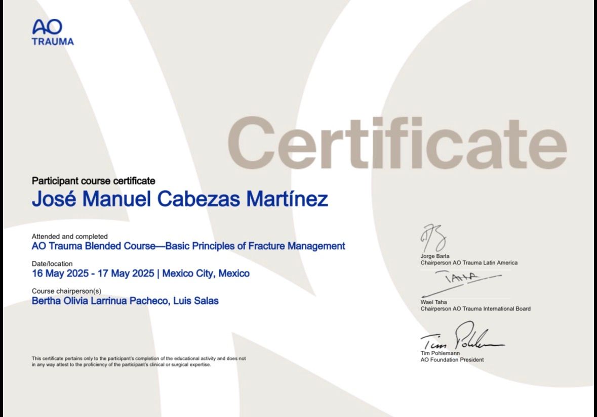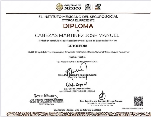 Soy médico especialista en Traumatología y Ortopedia, formado en una Unidad Médica de Alta Especialidad, y en dos de las mejores universidades del país (Universidad de Guadalajara y BUAP). Cuento con amplia experiencia para atenderte en el manejo de: Fracturas, Esguinces y luxaciones, Contusiones y desgarros musculares, Lesión de ligamentos y tendones, Lesiones deportivas, Dolor y desgaste de articulaciones, Dolor cervical, Dolor lumbar y afección del nervio ciático, Malformaciones pediátricas. Te invito a confiar en mí, estoy a tus órdenes y de tus seres queridos.