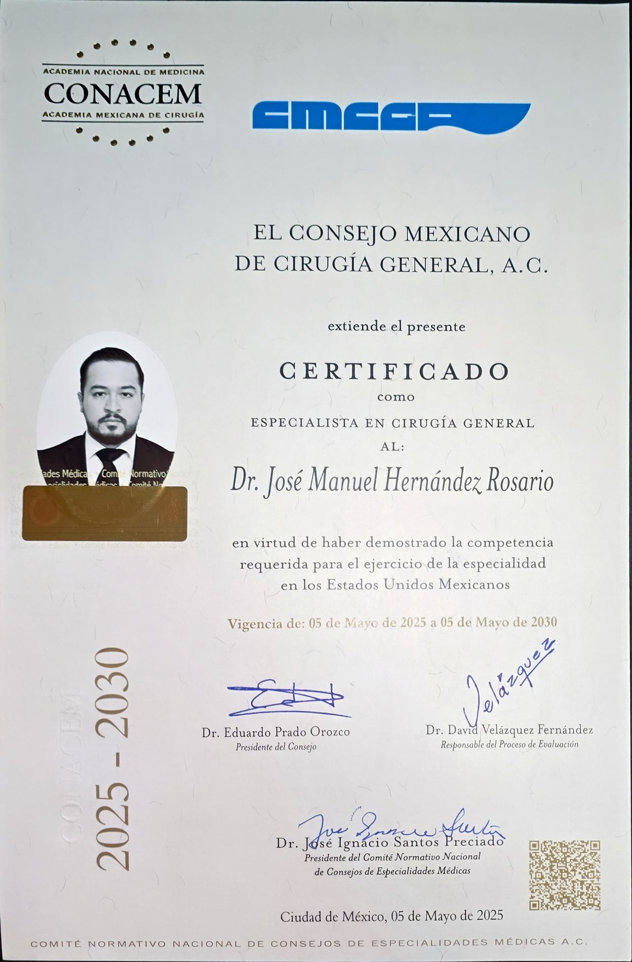 Soy Médico Cirujano y Cirujano General, egresado de la Universidad Autónoma de San Luis Potosí y con especialidad en Cirugía General por la Benemérita Universidad Autónoma de Puebla. Cuento con formación integral en cirugía abierta y laparoscópica, con experiencia en el manejo de urgencias quirúrgicas y procedimientos de mínima invasión.
