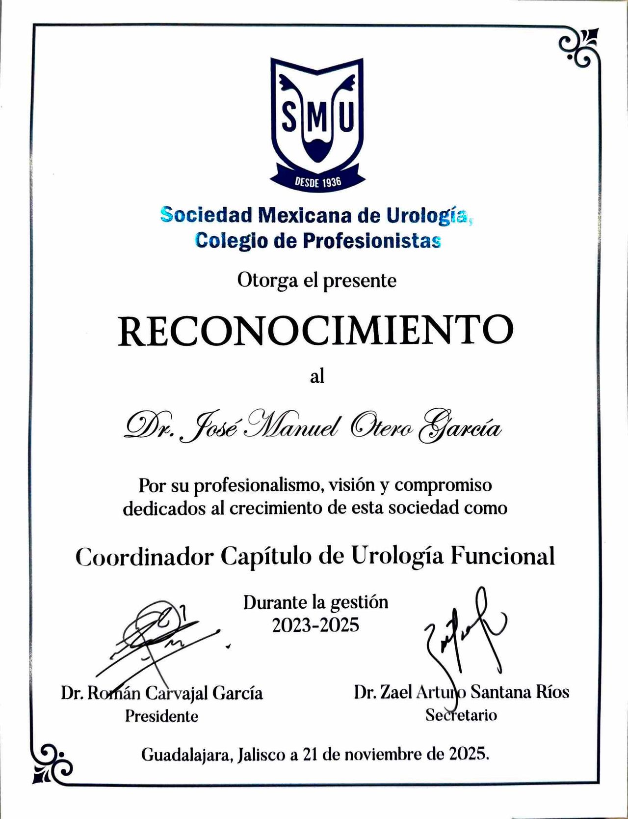 Estoy certificado por el Consejo Mexicano de Urología y soy miembro activo de asociaciones nacionales e internacionales como la American Urological Association y la European Association of Urology. También he participado en publicaciones científicas y en la elaboración de guías clínicas nacionales.