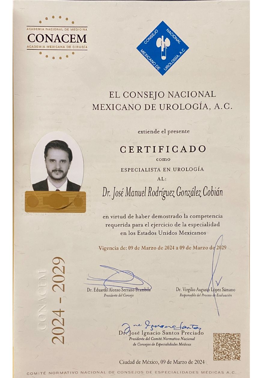 Soy urólogo certificado por el Consejo Nacional Mexicano de Urología, cuento con alta especialidad en Laparoscopía y Cirugía Robótica avalado por la UNAM y certificado en cirugía con sistema robótico Da Vinci. Tengo entrenamiento en cirugía de mínima invasión oncológica y reconstructiva en Estrasburgo, Francia. Soy miembro activo de la Sociedad Mexicana de Urología, de la American Urological Association y de la European Association of Urology.