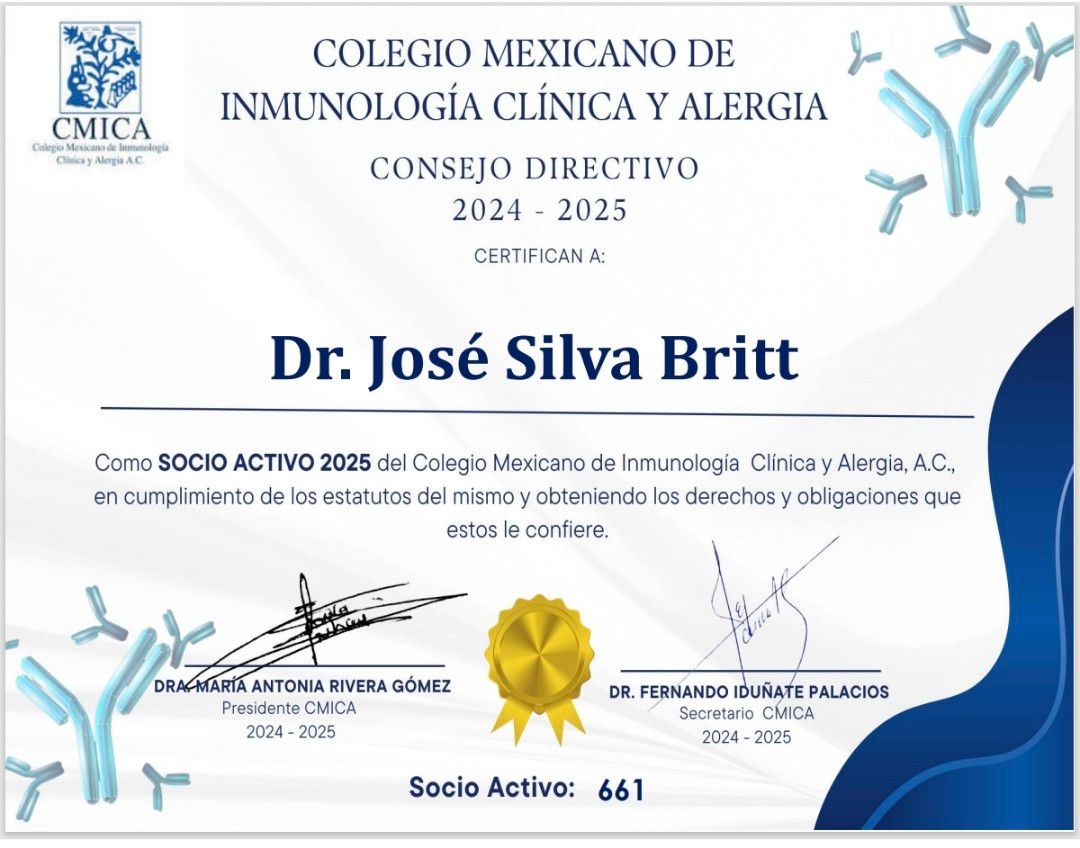Certificado por el consejo nacional de inmunologia clínica y alergia (CONICA)