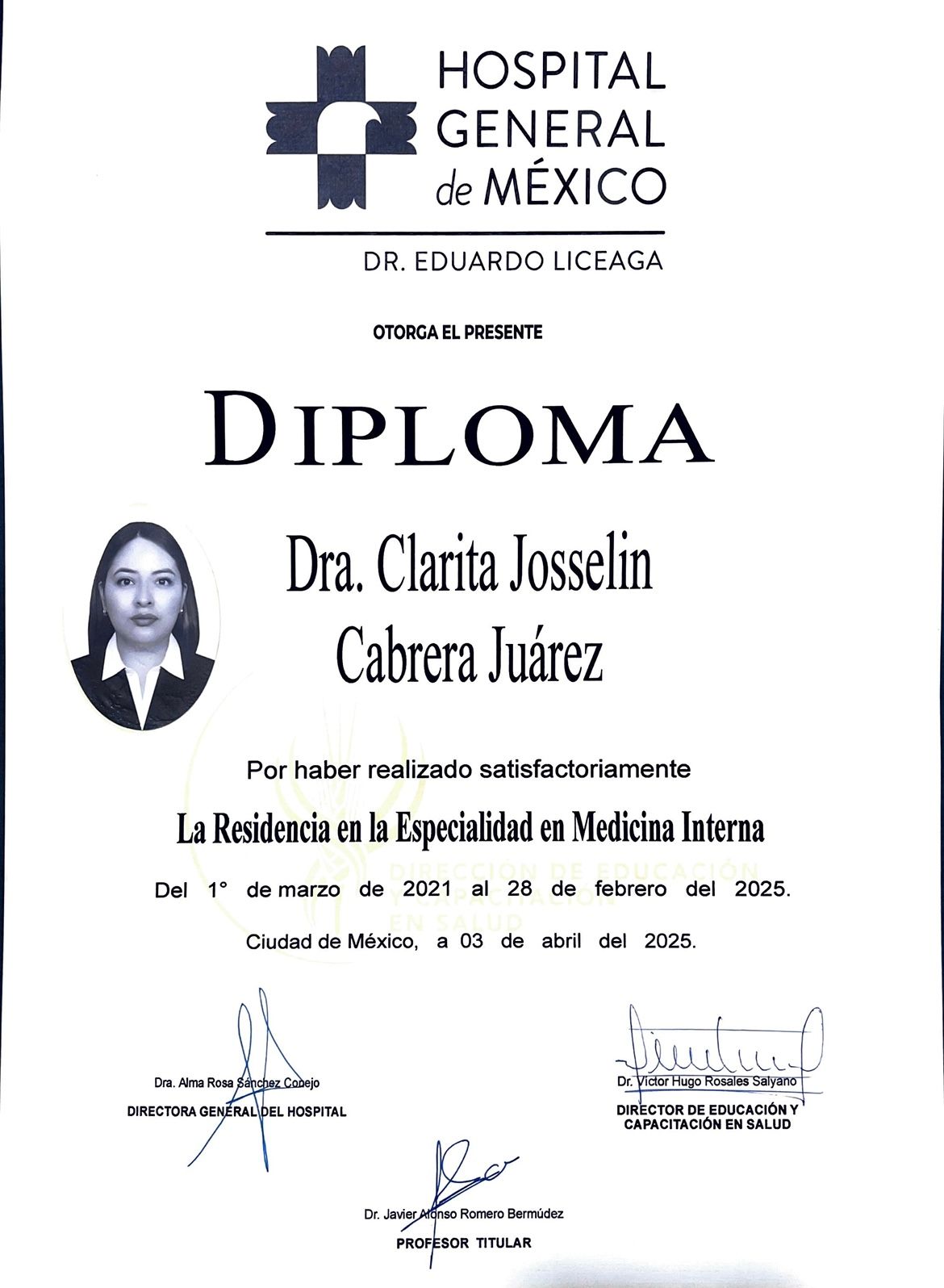 Cuento con la licenciatura de medico general y con la Especialidad medica de Medicina Interna, egresada del Hospital General de México, ambas avaladas por la Universidad Nacional Autónoma de México