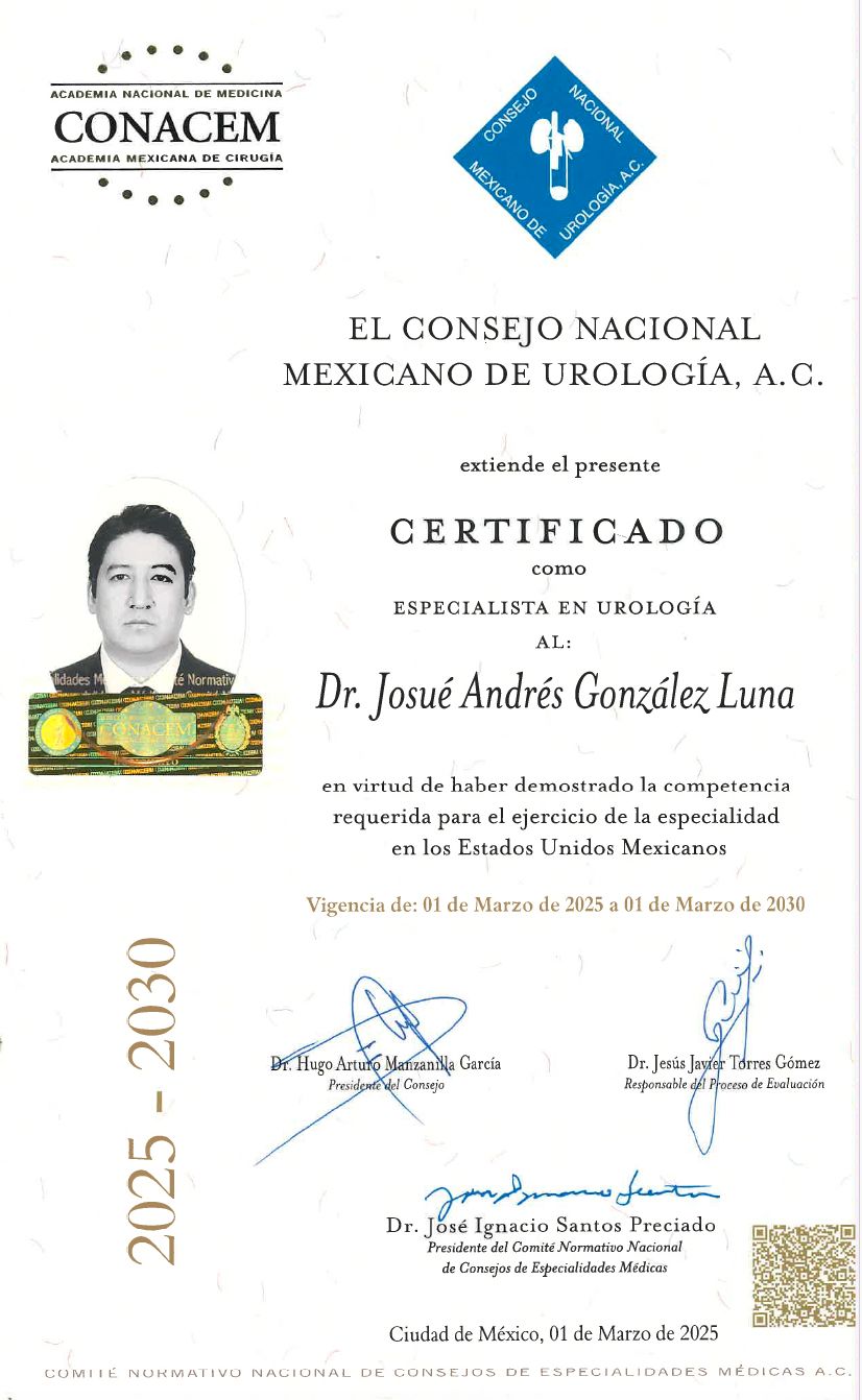 Soy Urólogo egresado de la Universidad Nacional Autónoma de México (UNAM), con formación en el Centro Médico Nacional 20 de Noviembre (ISSSTE).