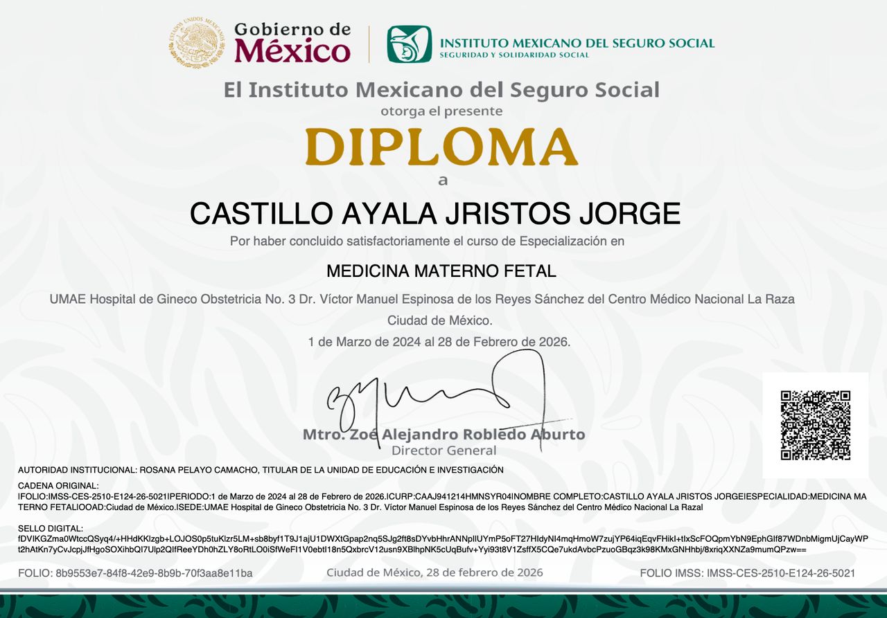 Soy médico especialista en ginecología, obstetricia y medicina materno-fetal, enfocado en brindar una atención integral, precisa y basada en evidencia a cada una de mis pacientes. Mi práctica está orientada tanto al cuidado de la salud de la mujer en todas sus etapas, como al seguimiento cercano del embarazo, con especial énfasis en la detección oportuna de riesgos y la toma de decisiones informadas.