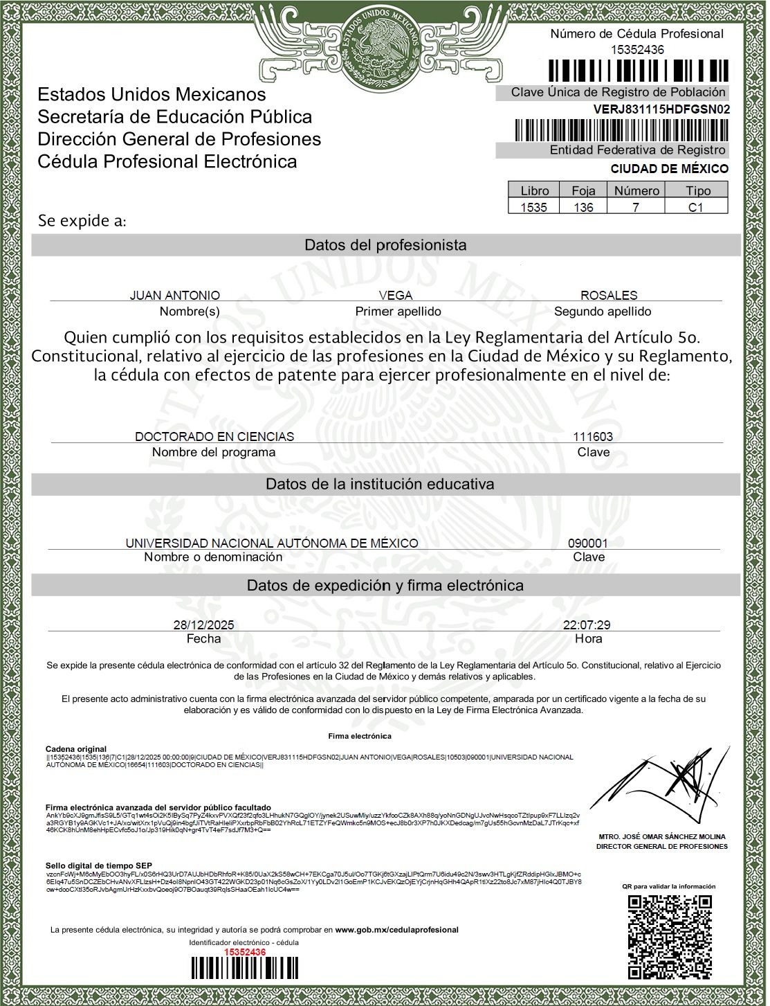 El Dr. Antonio Vega, obtuvo el primer lugar de su generación (2001-2008) titulándose con honores. Además de la especialidad en Cardiología con alta especialidad en ecocardiografía el Dr. Vega tiene los títulos de Maestría y Doctorado en Ciencias todos ellos avalados por la UNAM.