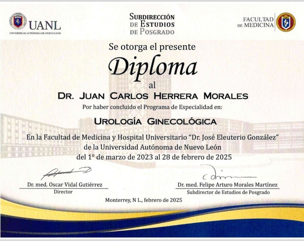 Egresado de la subespecialidad de Urología Ginecológica avalado por la Universidad Autónoma de Nuevo León