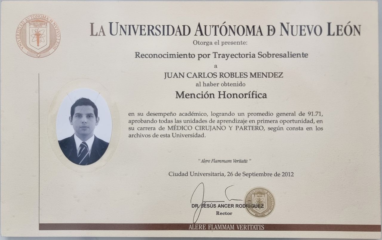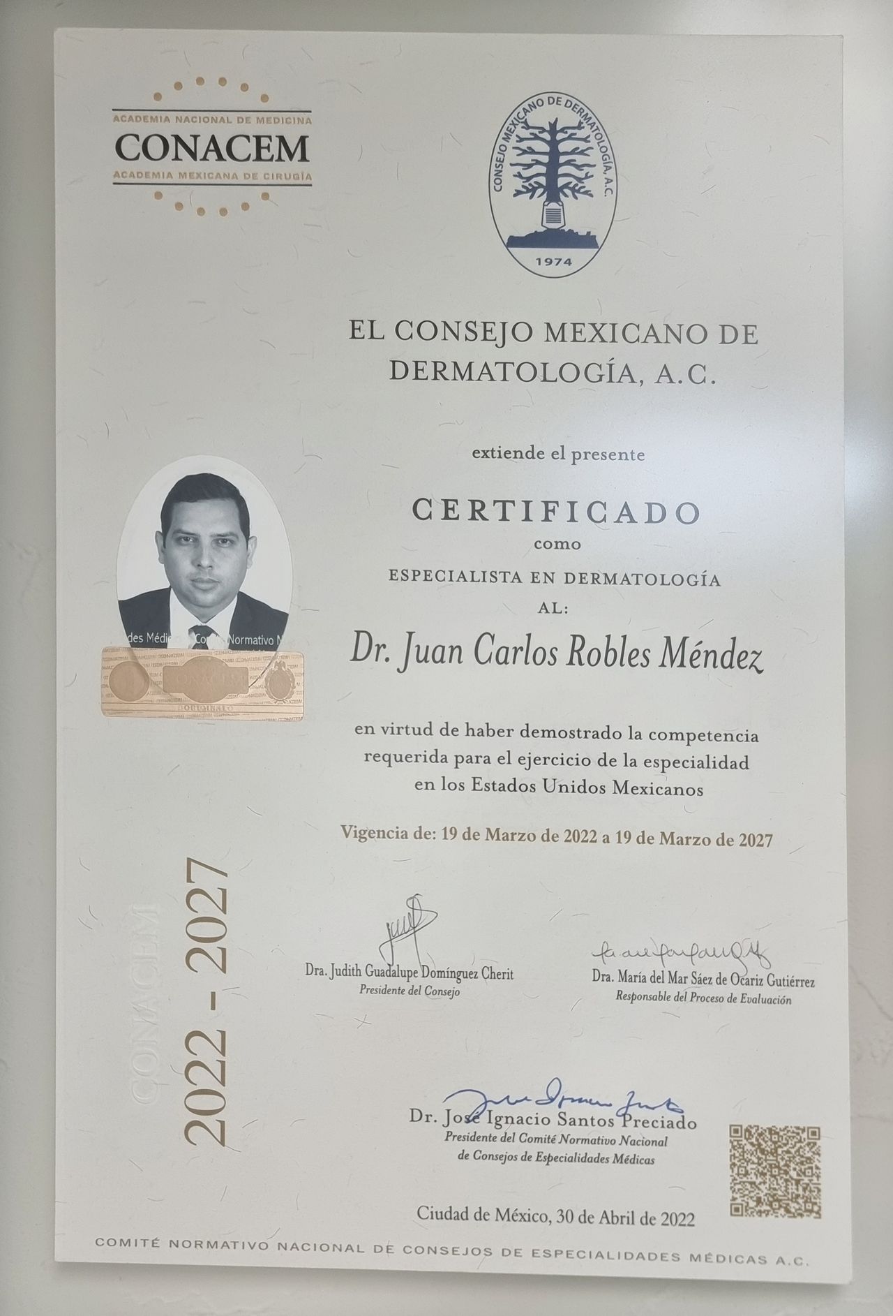 El Dr. JuanCarlosRoblesMéndez realizó la especialidad en Dermatología y la subespecialidad en Cirugía Dermatológica en el Hospital Universitario "Dr. José Eleuterio González" de la Universidad Autónoma de Nuevo León, centro académico de nivel internacional, considerado uno de los mejores en América Latina, donde consultó a más 10.000 pacientes y realizó más de 300 procedimientos quirúrgicos. Se graduó con Mención Honorífica de la carrera Médico Cirujano y Partero, en la Universidad Autónoma de Nuevo León. Realizó estancias académicas en los mejores centros dermatológicos del país como el Hospital de Nutrición y Ciencias Médicas "Dr. Salvador Zubirán" y el Instituto Dermatológico de Jalisco "Dr. José Barba Rubio". Cuenta con publicaciones científicas a nivel internacional en revistas de Estados Unidos, España, Inglaterra, India y México. Sus áreas de mayor interés y experticia son los trastornos del pelo, el acné, las enfermedades de transmisión sexual y el cáncer de piel. En el 2018, 2019, 2020 y 2025 ha sido nominado por Doctoralia como unos de los mejores 10 dermatólogos en el país.