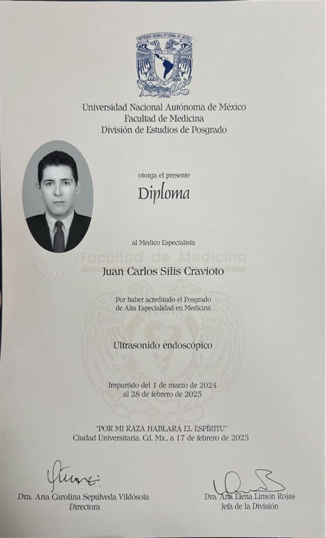 ¡Hola! Soy el Dr. Juan Carlos Silis, médico especialista en Cirugía General y entrenamiento en Laparoscopia Avanzada, con alta especialidad en Endoscopía Gastrointestinal y Ultrasonido Endoscópico, egresado del Hospital General de México. Tengo la experiencia y conocimiento para tratar diferentes enfermedades quirúrgicas y no quirúrgicas, eligiendo la mejor opción de tratamiento ofreciendo procedimientos tanto abierto como de mínima invasión. Mi fortaleza es ser un profesional comprometido y apasionado con la salud, siempre buscando el beneficio del paciente.
