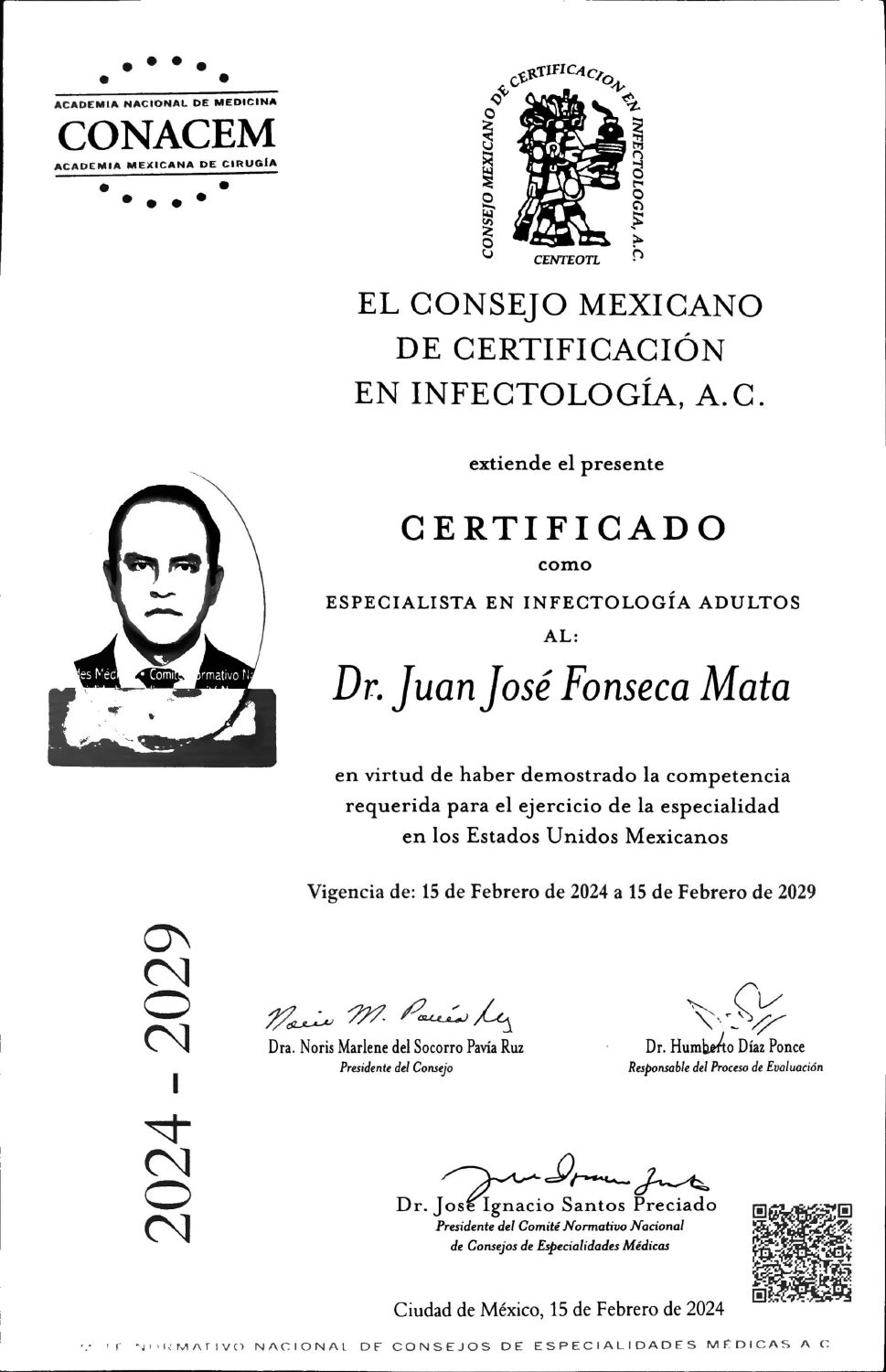 Estoy certificado por la Asociación Mexicana de Infectología y Microbiología Clínica (AMIMC) y por el Colegio Mexicano de Medicina Interna (CMIM), lo cual garantiza que mi práctica médica está actualizada y alineada con los más altos estándares nacionales e internacionales.