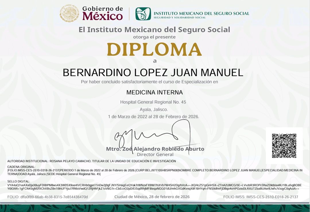 Médico Internista certificado por el Consejo Mexicano de Medicina Interna (CMMI), con mención honorífica.