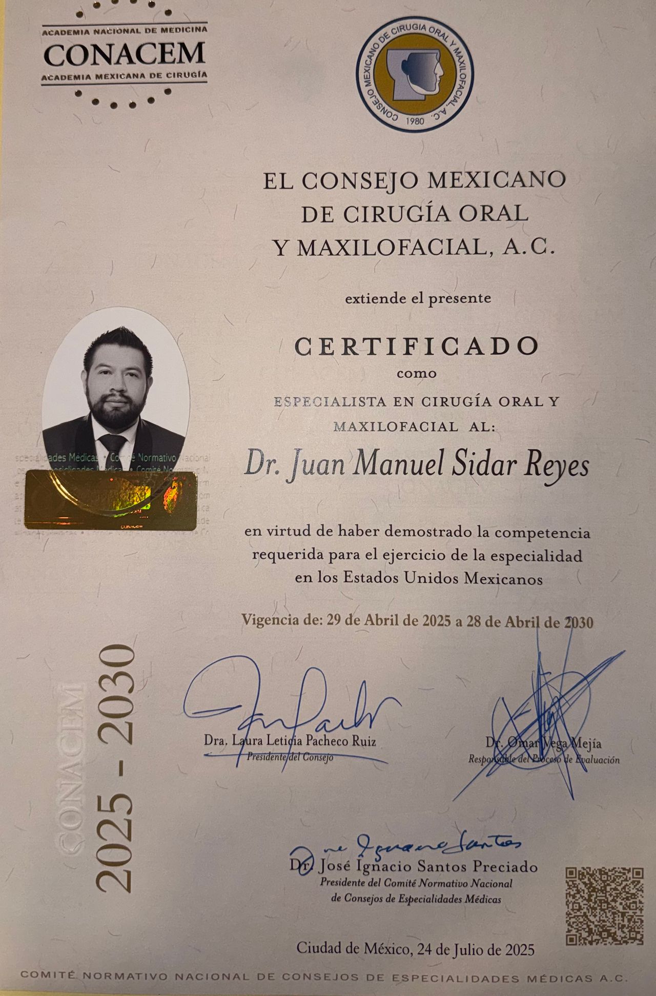 Soy Juan Manuel Sidar Reyes, cirujano oral y maxilofacial certificado por el Consejo Mexicano de Cirugía Oral y Maxilofacial originario de Ciudad de México, con 31 años y una sólida formación en el diagnóstico y tratamiento de las diversas condiciones que afectan el sistema estomatognático.