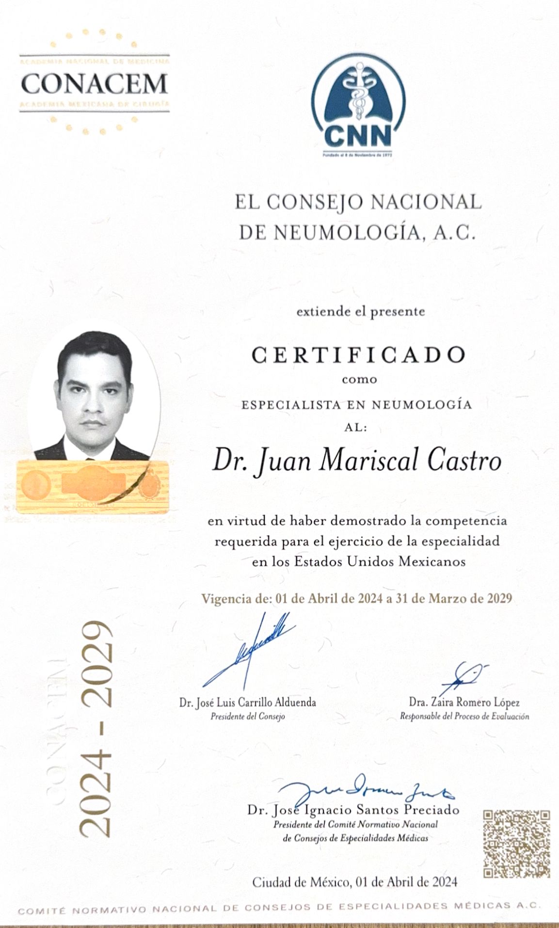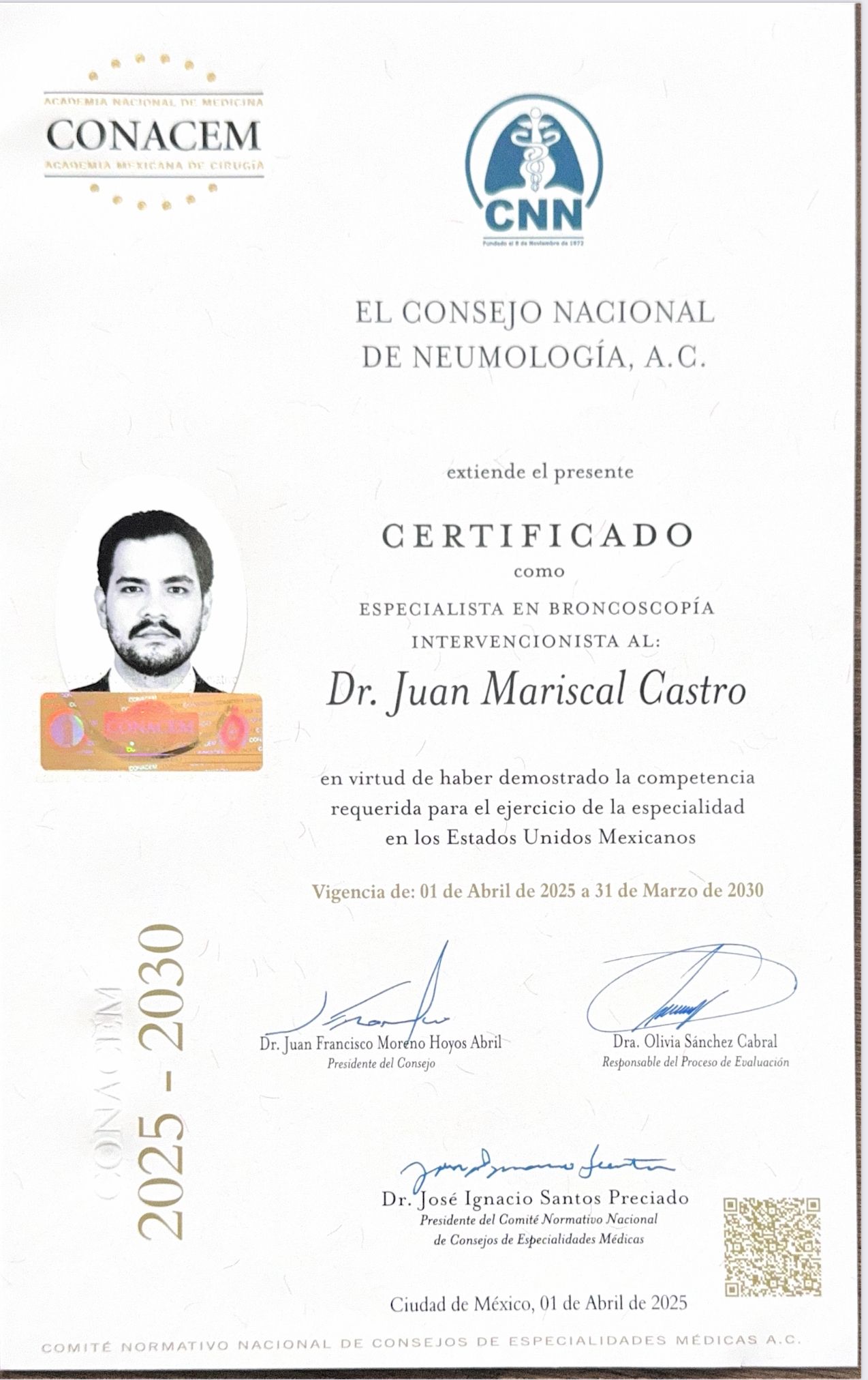 Soy Especialista en Neumología con Alta Especialidad en Neumología Intervencionista (Broncoscopia), ambas formaciones realizadas en el Instituto Nacional de Enfermedades Respiratorias (INER). Cuento con certificaciones en Neumología y Broncoscopia Intervencionista otorgadas por el Consejo Nacional de Neumología, y soy miembro activo de la Sociedad Mexicana de Neumología y Cirugía de Tórax.