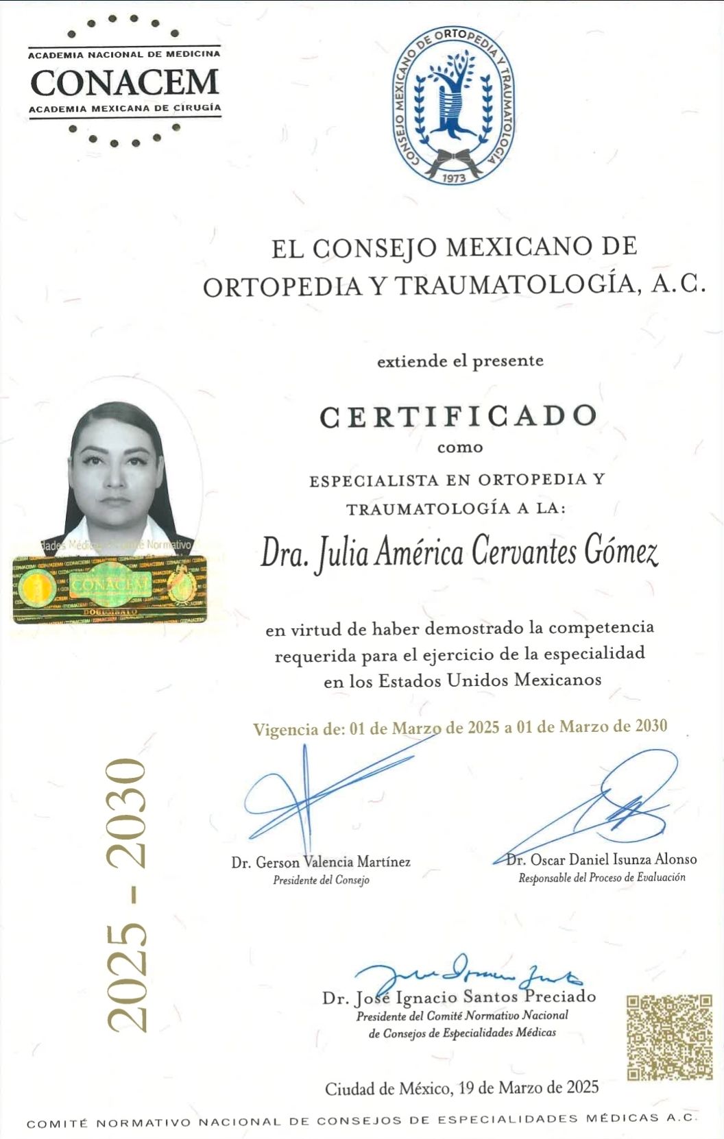 Cuento con certificación 2025 por el Consejo Mexicano de Ortopedia y Traumatología.